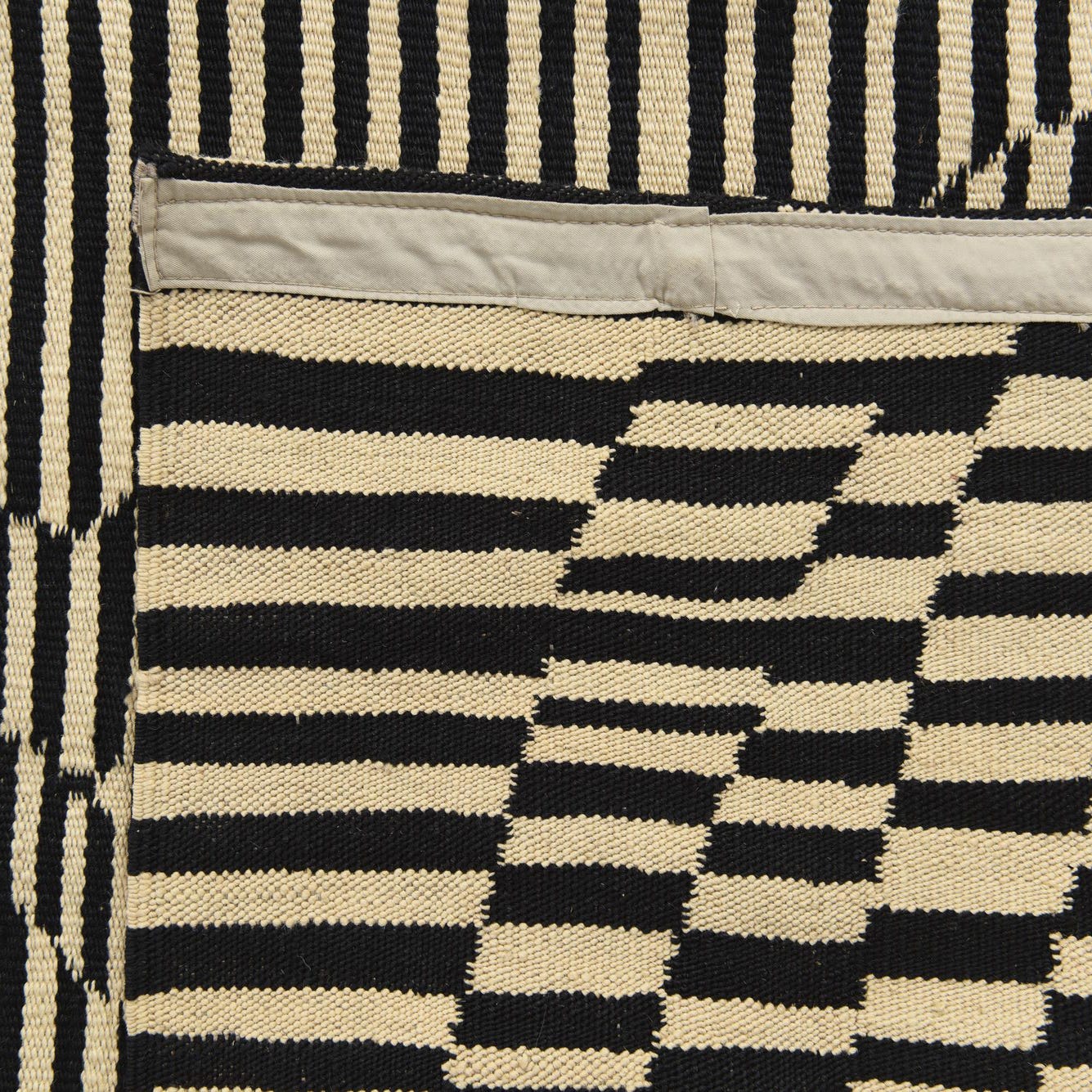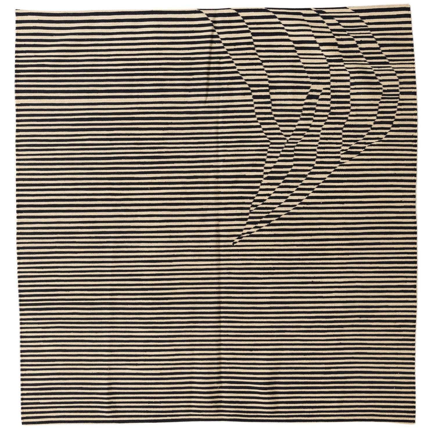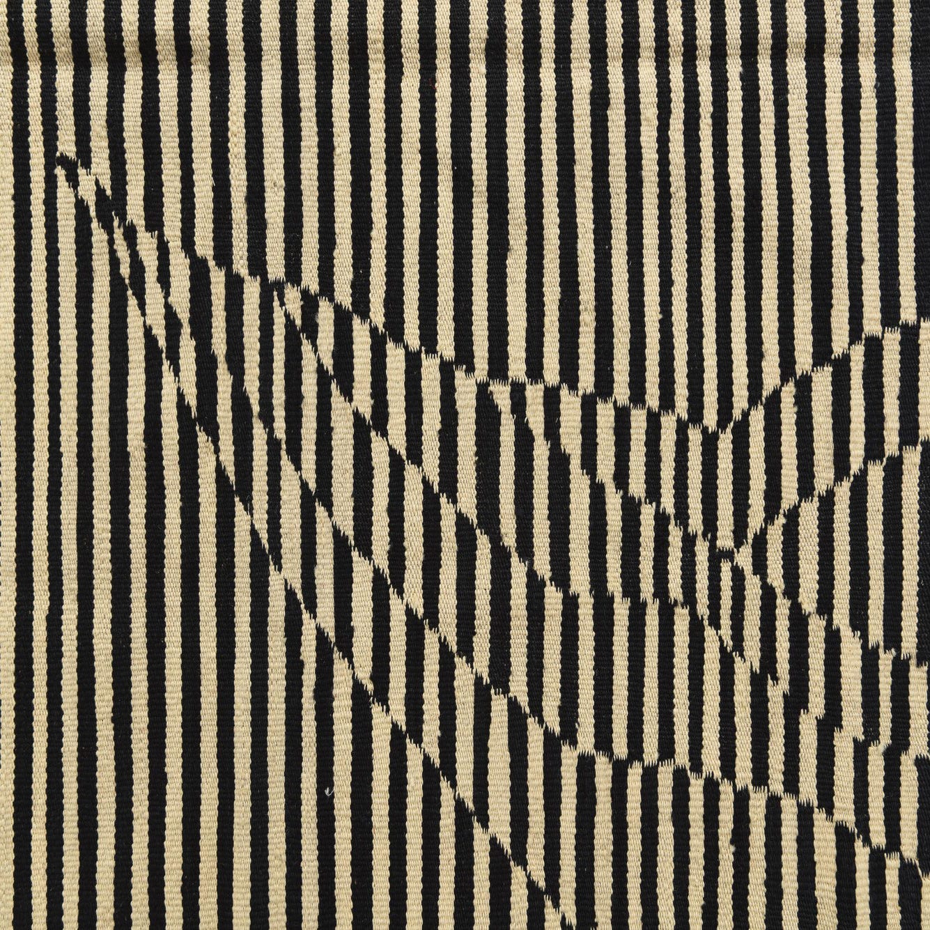 Part of the Kilim Modern collection, this hand-woven wool rug brings a dynamic visual impact to any room. The design showcases a striking linear pattern, punctuated by a playful distortion that gives the illusion of movement. Its color palette consists of bold black and cream stripes, offering a timeless contrast that is both versatile and impactful.
