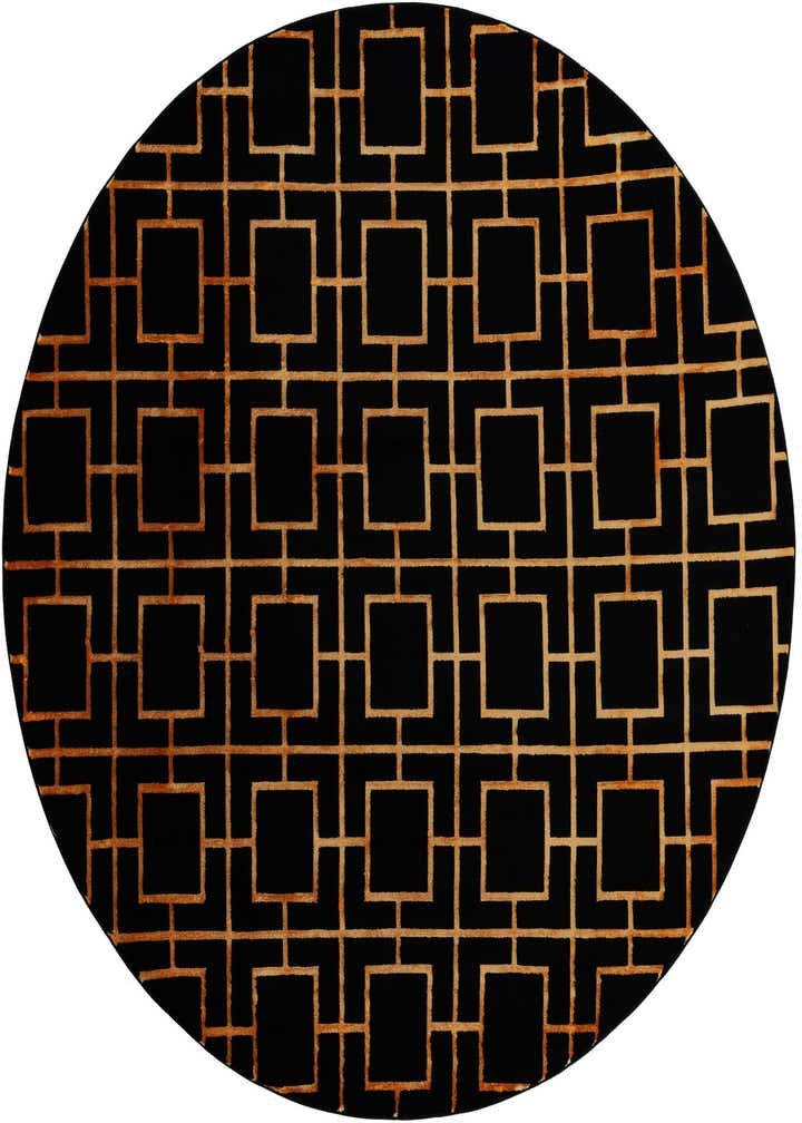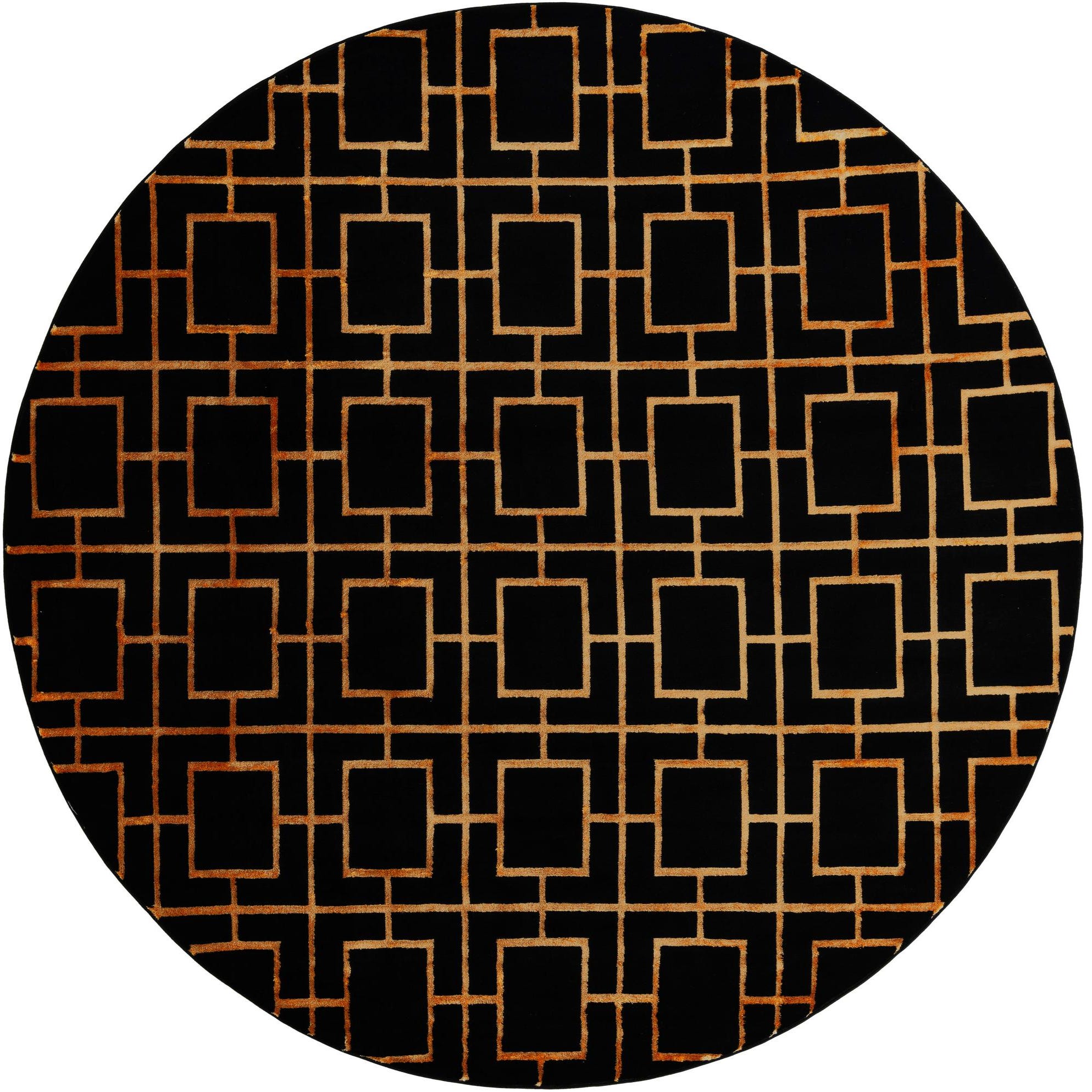 A 10' round black rug with a repeating modern gold trellis pattern, suitable for a living room or patio.