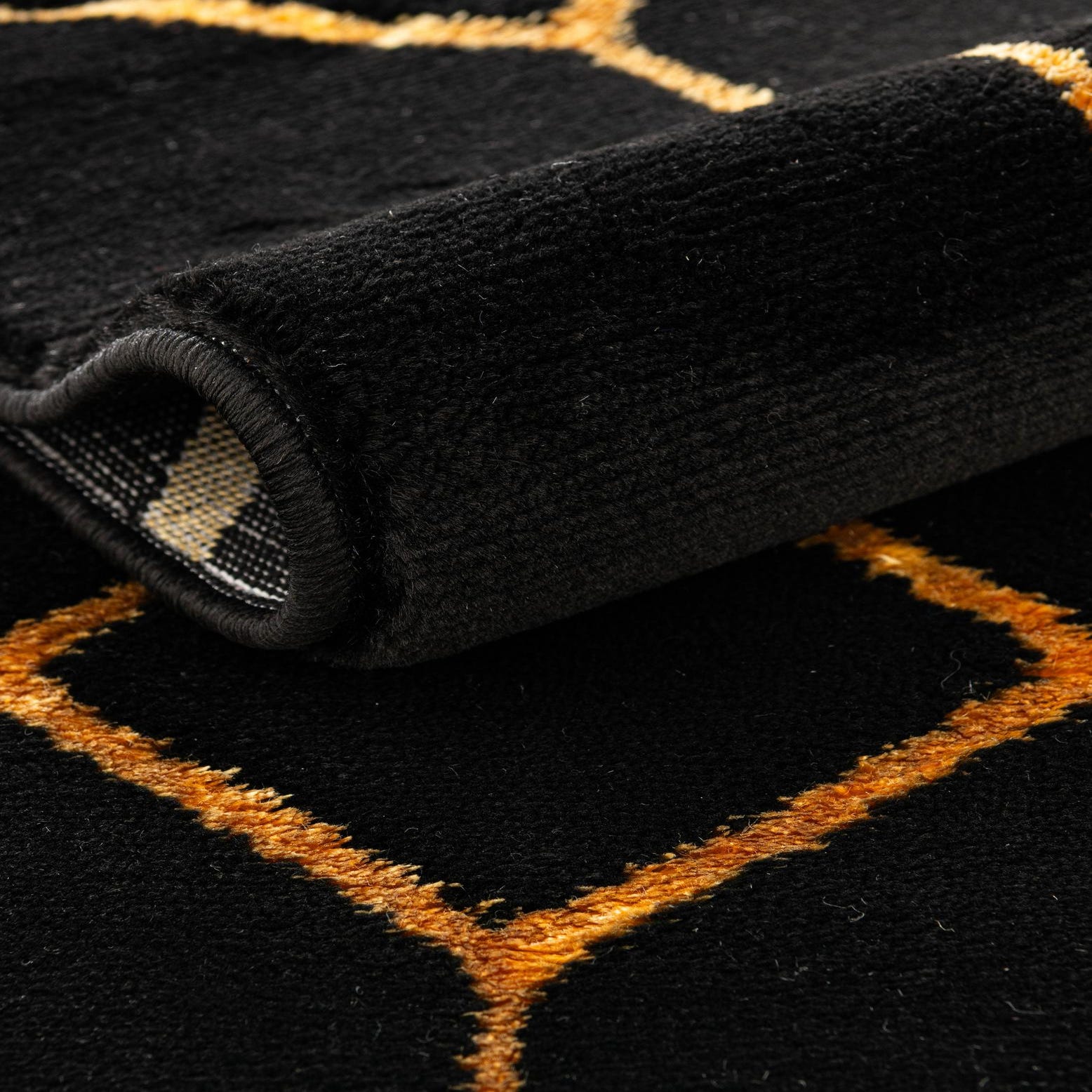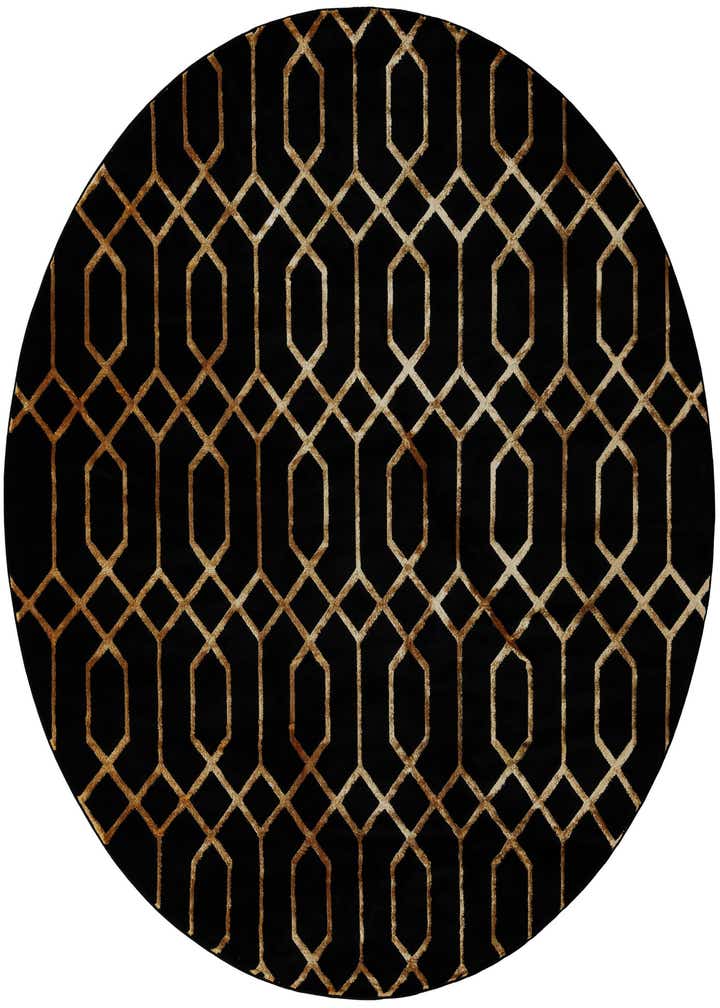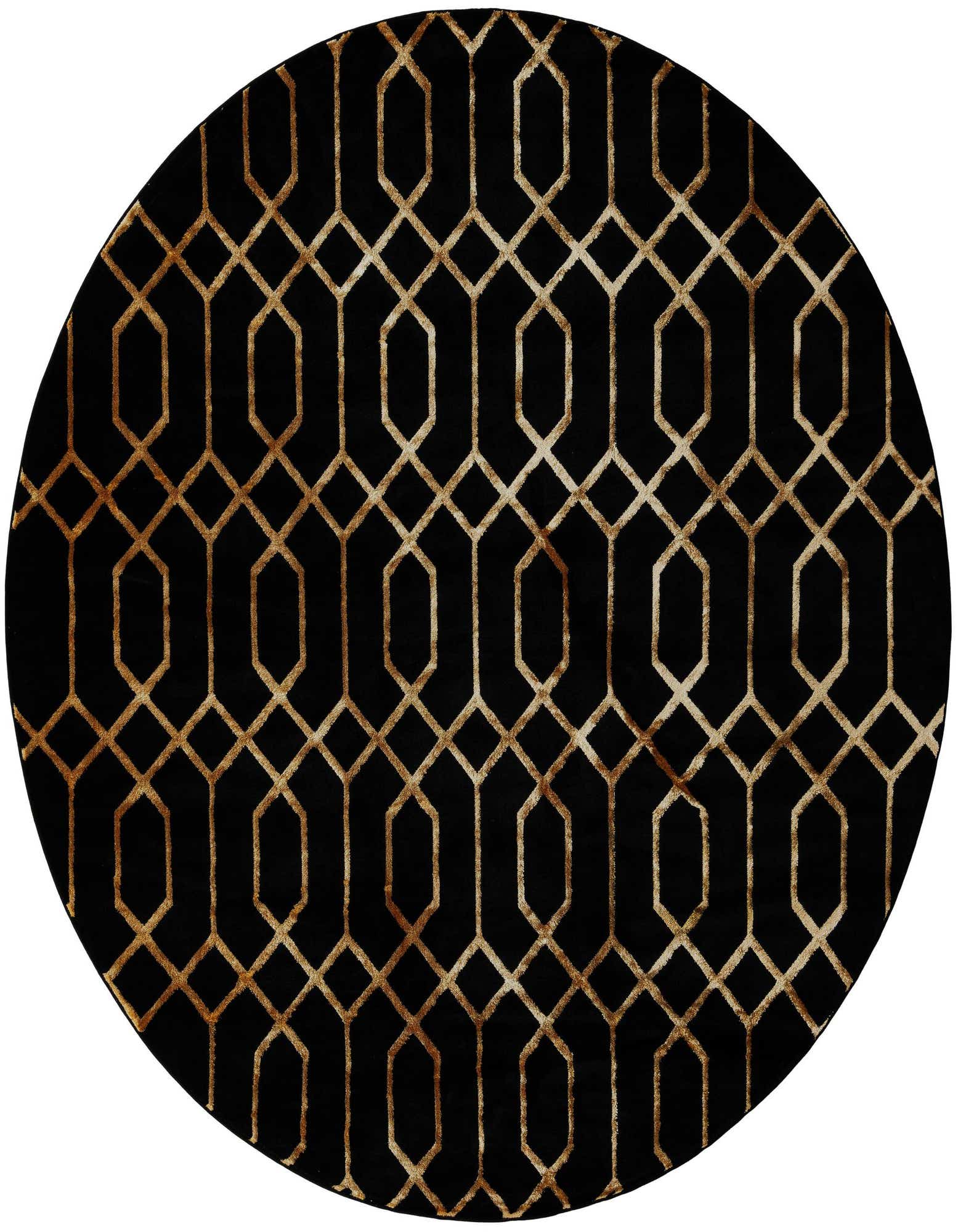 A 10-foot round black rug with a gold modern geometric trellis pattern, suitable for a living room.