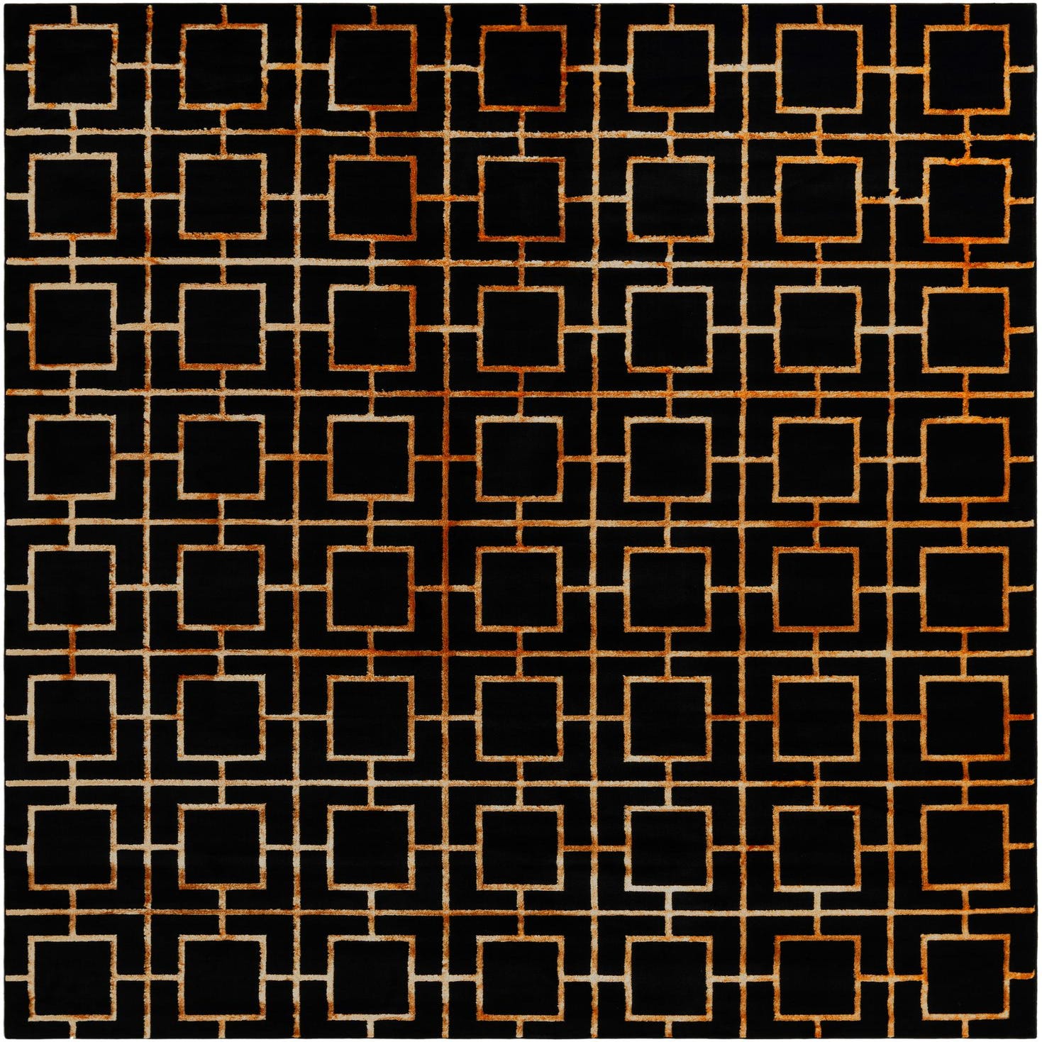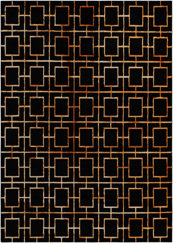 A bold geometric trellis of interlocking squares cuts across a deep black field, the gold pattern offering a warm, luminous contrast. Machine-made from 70% polypropylene and 30% polyester, the rug has a soft, low-to-medium pile with a subtle sheen where the gold fibers catch light. The raised grid provides a tactile distinction against the smooth black background, giving the surface a layered, dimensional feel underfoot.