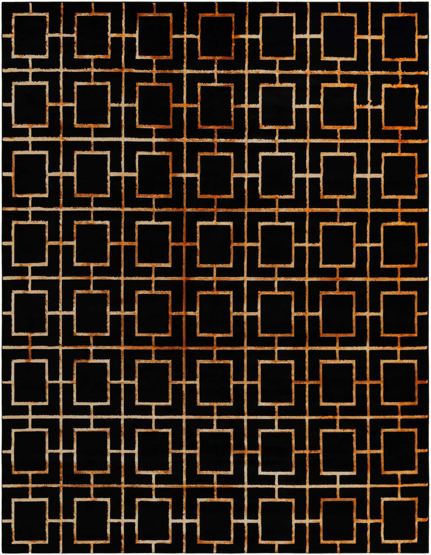 A 10x13 rectangular black area rug with a modern gold geometric trellis pattern, suitable for a living room.
