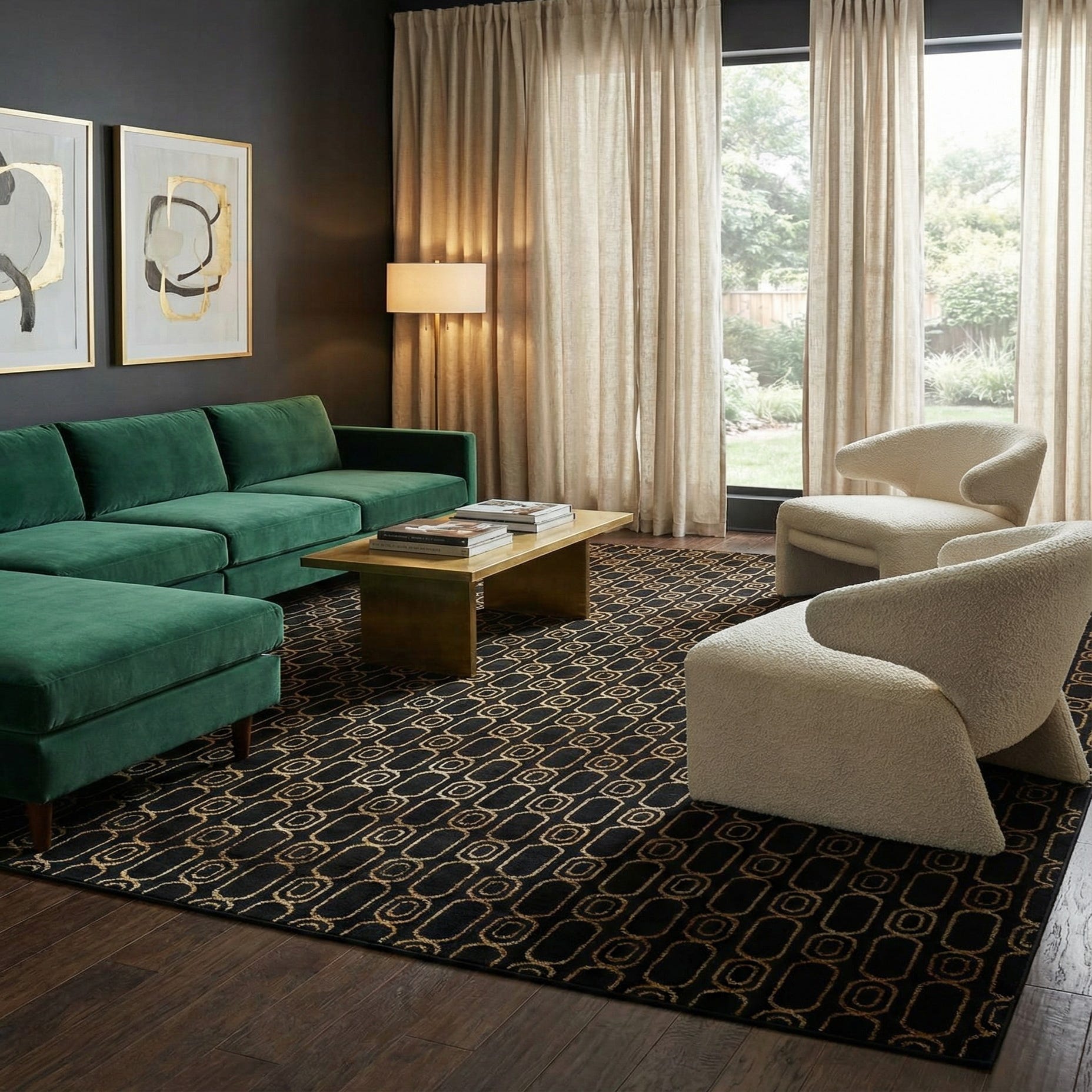 Works well in contemporary living rooms and mid-century modern settings where bold contrast is needed; pair it with leather seating, brass or matte-black accents, and warm wood tones. It also anchors a formal dining area or a large seating arrangement, and it can add a polished, sophisticated layer to a home office or media room. The black-and-gold palette makes it easy to coordinate with neutral upholstery or richer jewel tones for a dramatic, grounded look.