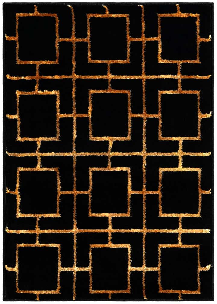 A 2x3 rectangular black rug with a modern gold trellis pattern, featuring a textured, high pile.