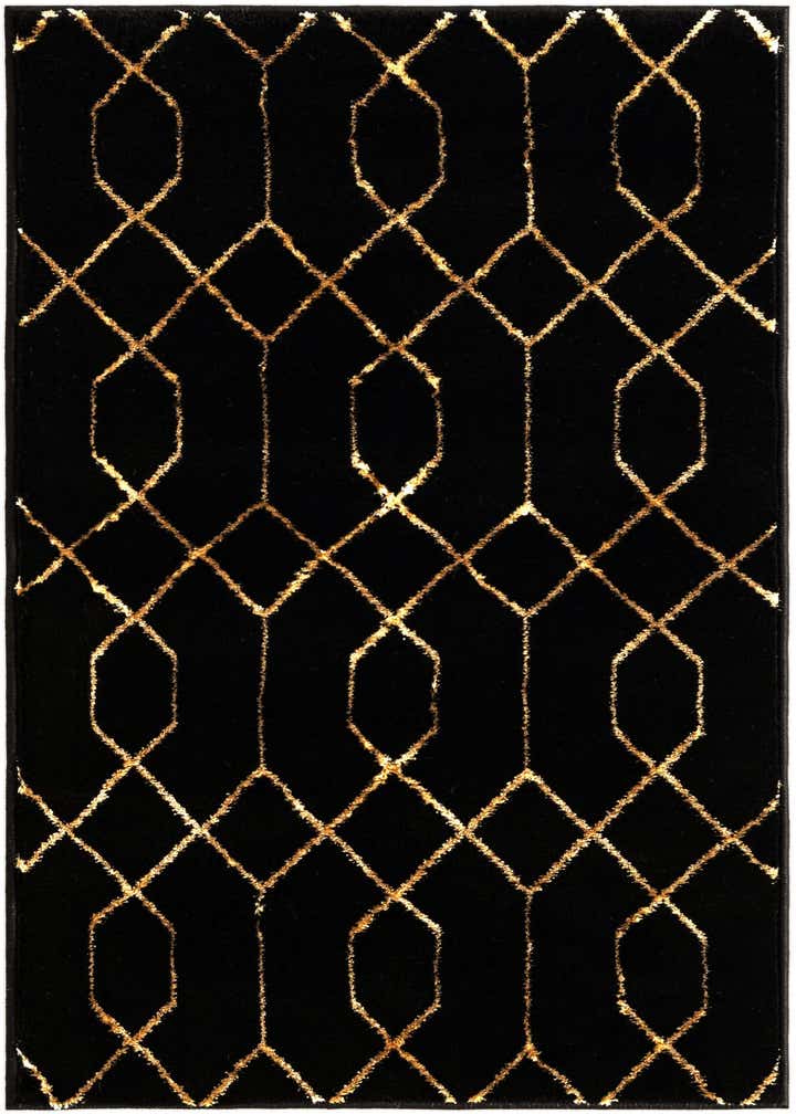 A 2x3 rectangular Marilyn Monroe Glam Trellis rug featuring a modern gold geometric trellis pattern on a black background.
