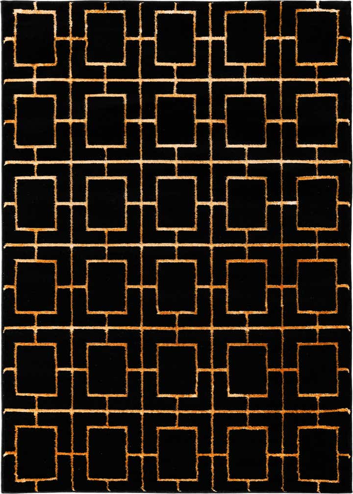 A striking geometric trellis pattern in warm gold sits against a deep black field, forming a structured grid of linked rectangles that feels both modern and graphic. The gold lines have a slightly raised, cut-pile texture that you can feel underfoot, while the black ground is low and velvety, offering a subtle sheen where light catches the polyester fibers. Machine-made from 70% Polypropylene and 30% Polyester, this rug combines a smooth hand with clear pattern definition.