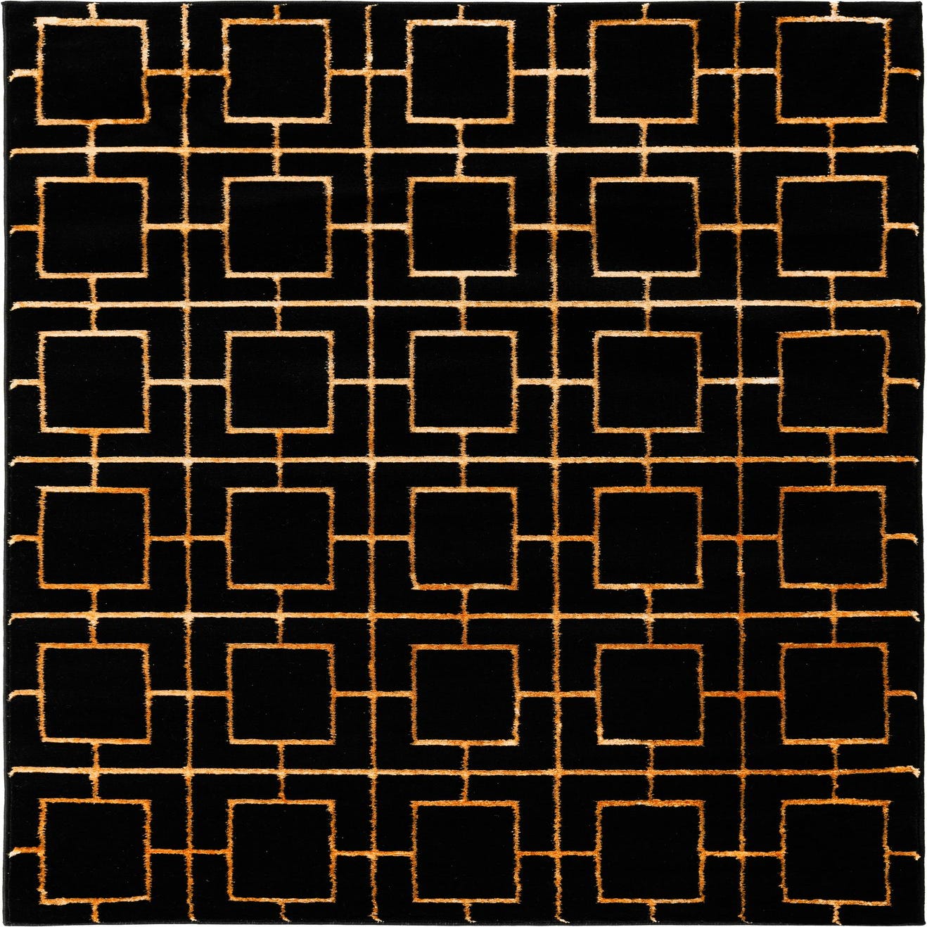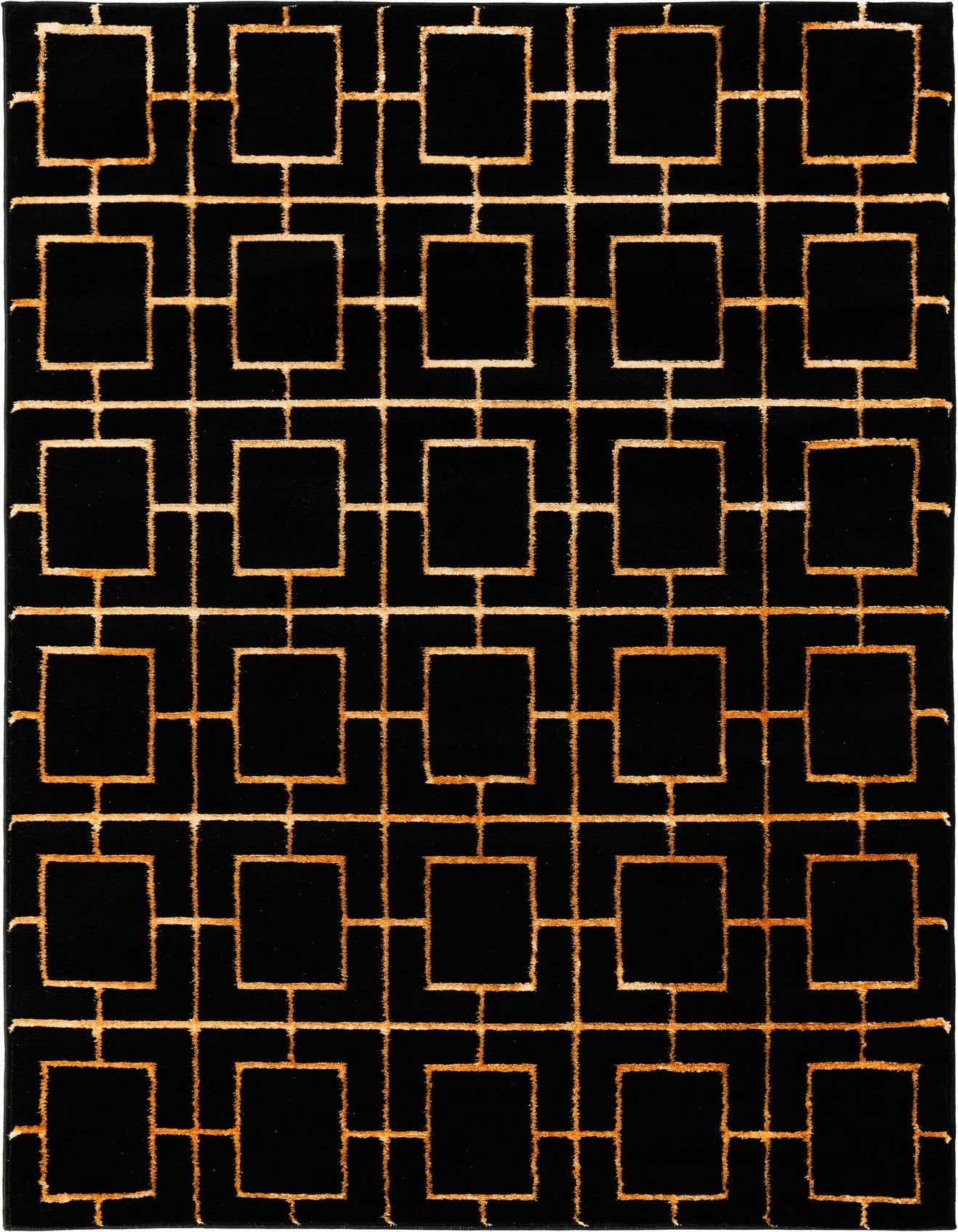 Place this rug to anchor a seating area or beneath a coffee table to add definition and contrast on hardwood or tile floors. It works well in contemporary living rooms, glam or art-deco–inspired bedrooms, and polished home offices—pair it with brass accents, velvet upholstery, or lacquered furniture for a cohesive look. The bold black-and-gold palette provides a dramatic base that complements neutral walls or richer, jewel-toned decor.