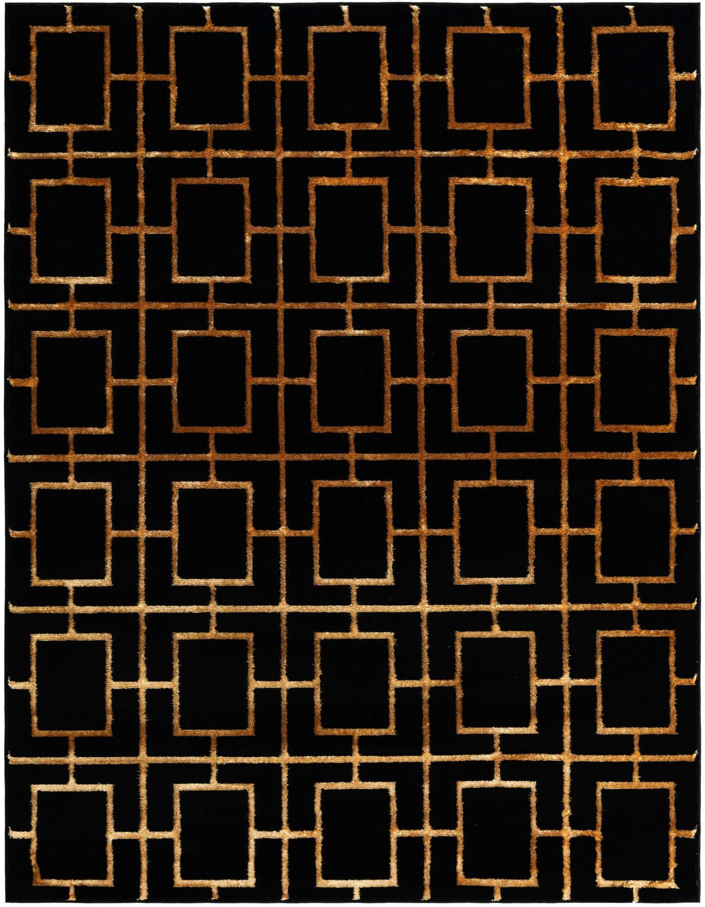 A 5x7 rectangular black modern area rug with a repeating gold geometric trellis pattern, suitable for a living room or patio.