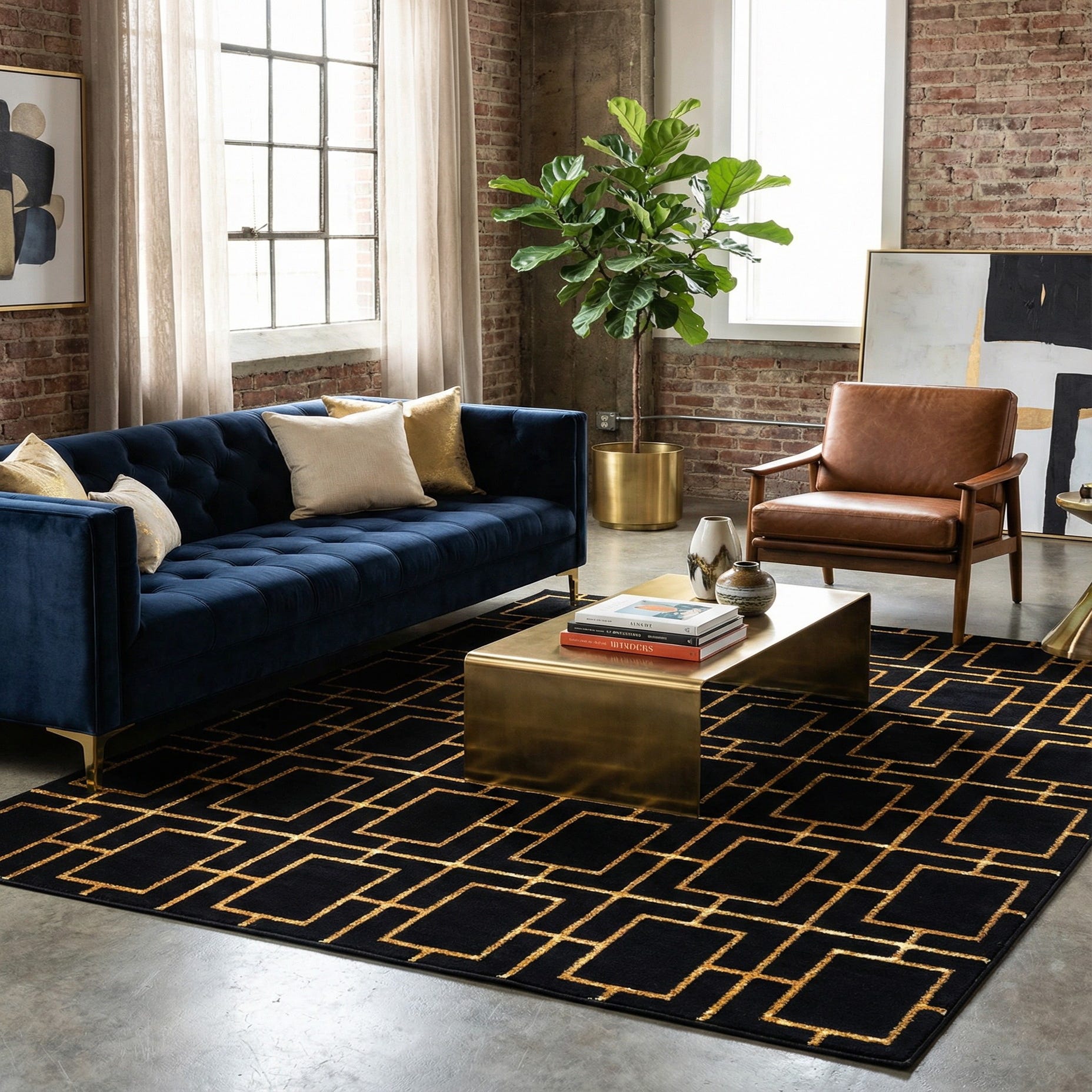 This rug pairs naturally with modern glam and Art Deco-inspired interiors—think velvet sofas, brass or mirrored accents, and clean-lined furniture. It also works in contemporary living rooms, a bold foyer statement, or a home office where a strong anchor is needed beneath seating or a desk. The black-and-gold palette makes it easy to coordinate with monochrome schemes or richer jewel tones for layered contrast.