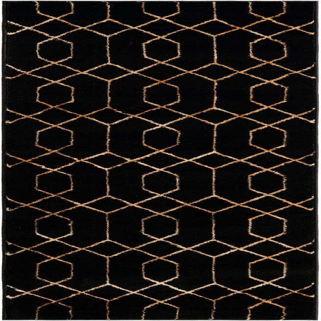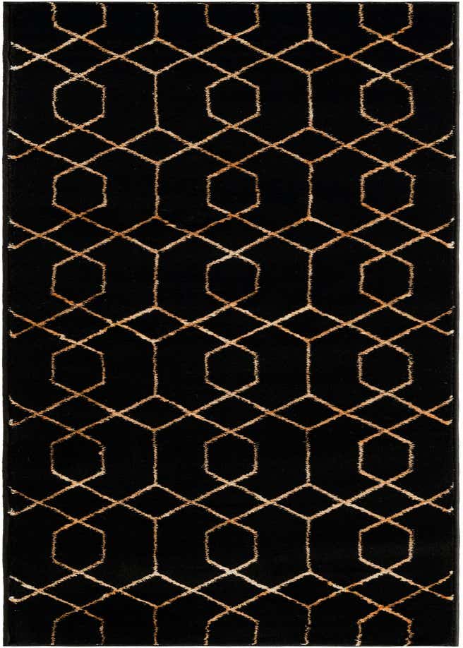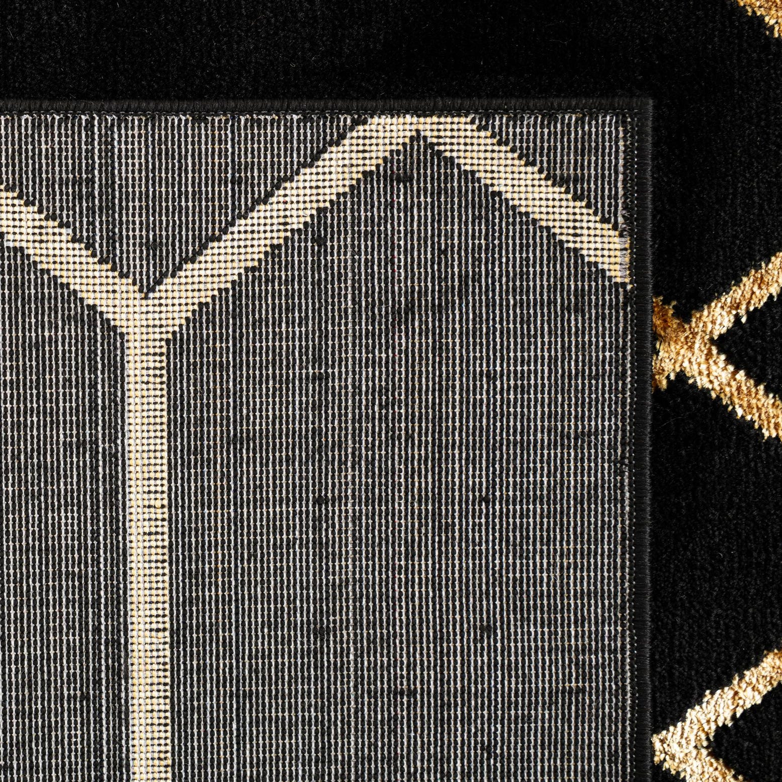 A black runner rug with a modern gold geometric trellis pattern, ideal for hallways or entryways.
