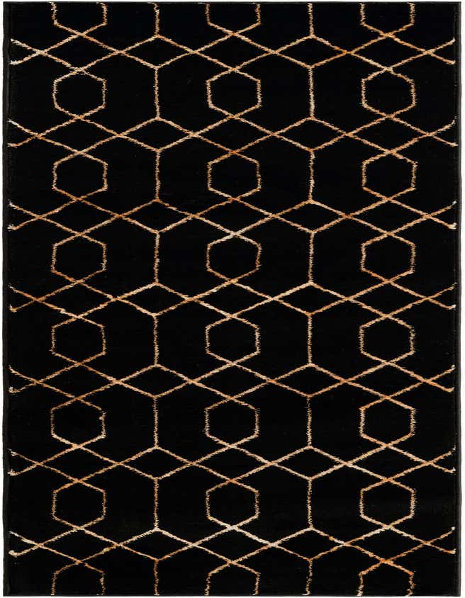 A bold black field sets the stage for a repeating trellis of gold lines, arranged as alternating elongated hexagons and diamond links that run the length of the piece. The geometric motif is rendered with a slightly brushed, uneven edge that gives the gold a lived-in, textural quality against the deep background. Machine-made from 70% polypropylene and 30% polyester, the runner has a low, soft pile with a subtle sheen from the polyester fibers and a smooth, comfortable hand underfoot that still holds the pattern definition crisp.