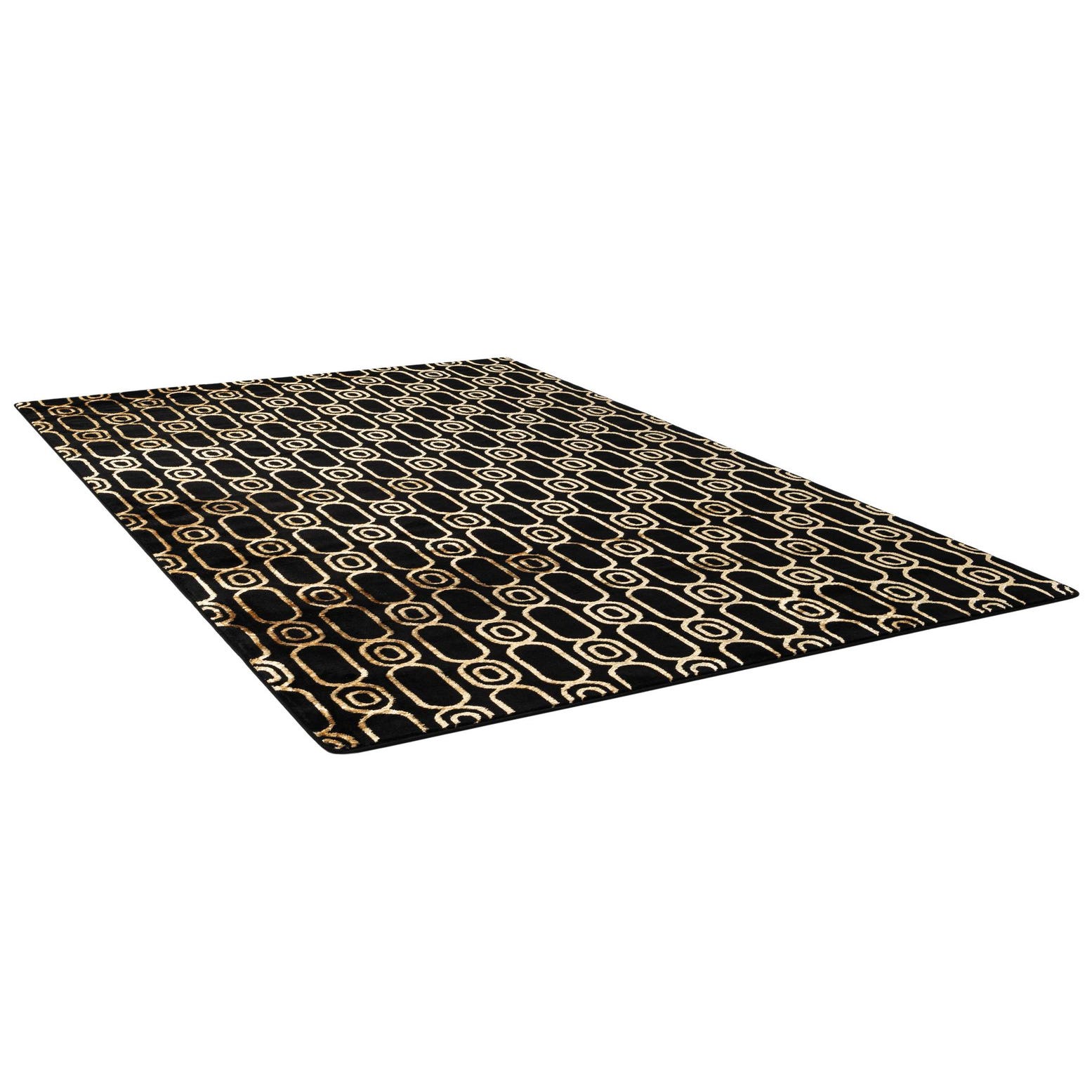 A 6x9 rectangular black rug with a modern geometric pattern of interconnected gold ovals, suitable for a living room.