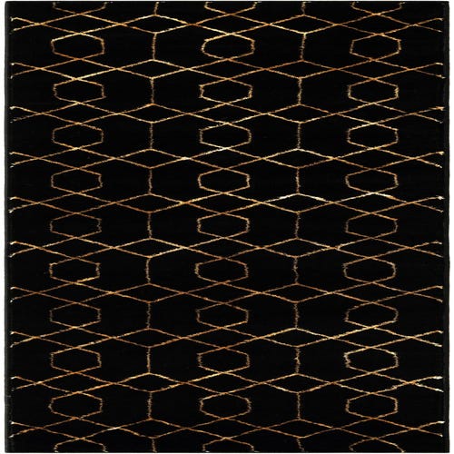A bold black field is crossed by a metallic gold trellis in a repeating geometric lattice—interlocking diamonds and elongated octagons—whose slightly irregular edges give the pattern a hand-drawn, brushed-metal look. The contrast between the deep black background and the warm gold lines creates a refined, modern-glam aesthetic. Machine-made from 70% polypropylene and 30% polyester, the pile has a low-to-medium height with a soft, slightly cushioned feel underfoot; the polyester highlights add a subtle sheen that catches light as you move across it.