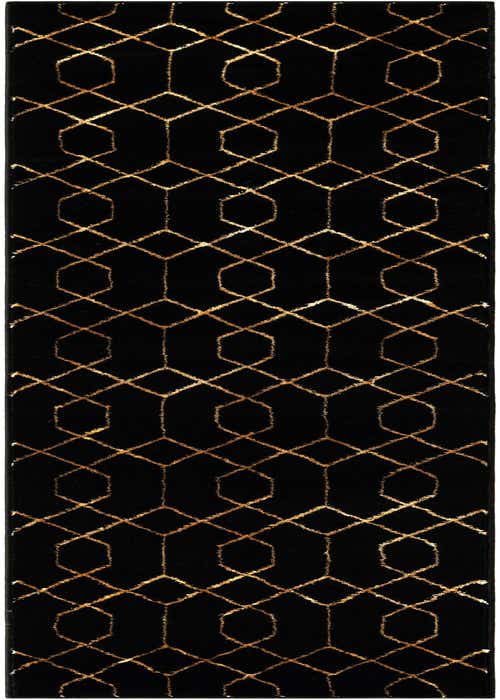 A bold black field is crossed by a metallic gold trellis in a repeating geometric lattice—interlocking diamonds and elongated octagons—whose slightly irregular edges give the pattern a hand-drawn, brushed-metal look. The contrast between the deep black background and the warm gold lines creates a refined, modern-glam aesthetic. Machine-made from 70% polypropylene and 30% polyester, the pile has a low-to-medium height with a soft, slightly cushioned feel underfoot; the polyester highlights add a subtle sheen that catches light as you move across it.