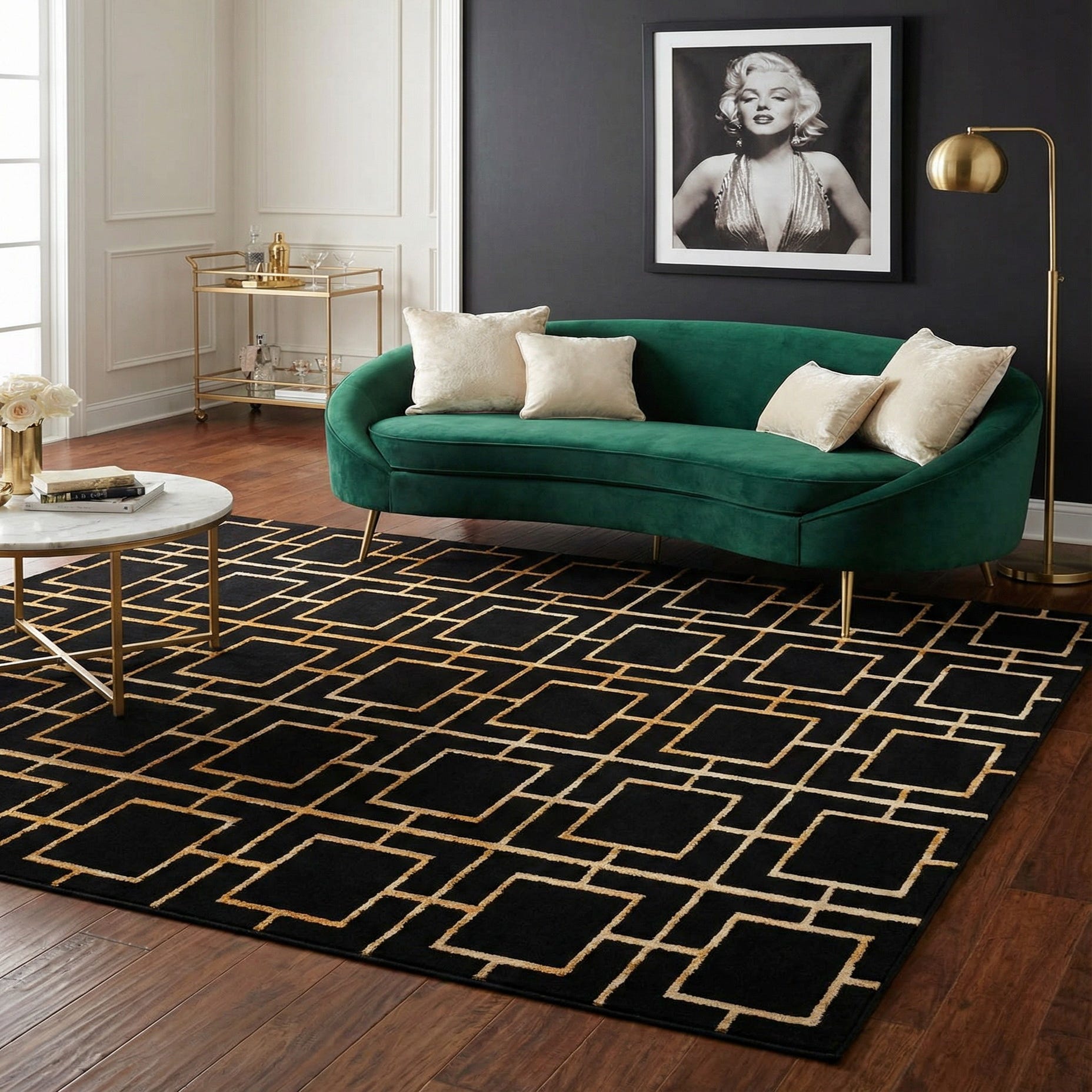 A bold geometric trellis of gold rectangles sits against a deep black ground, creating a structured, modern pattern with a touch of vintage glamour. Machine made from 70% polypropylene and 30% polyester, the rug has a dense, low-pile construction that feels soft underfoot and shows a subtle, luminous quality where the gold fibers catch the light. The raised gold lines offer a slight textural contrast to the smooth black field, giving the surface both visual depth and a tactile presence.