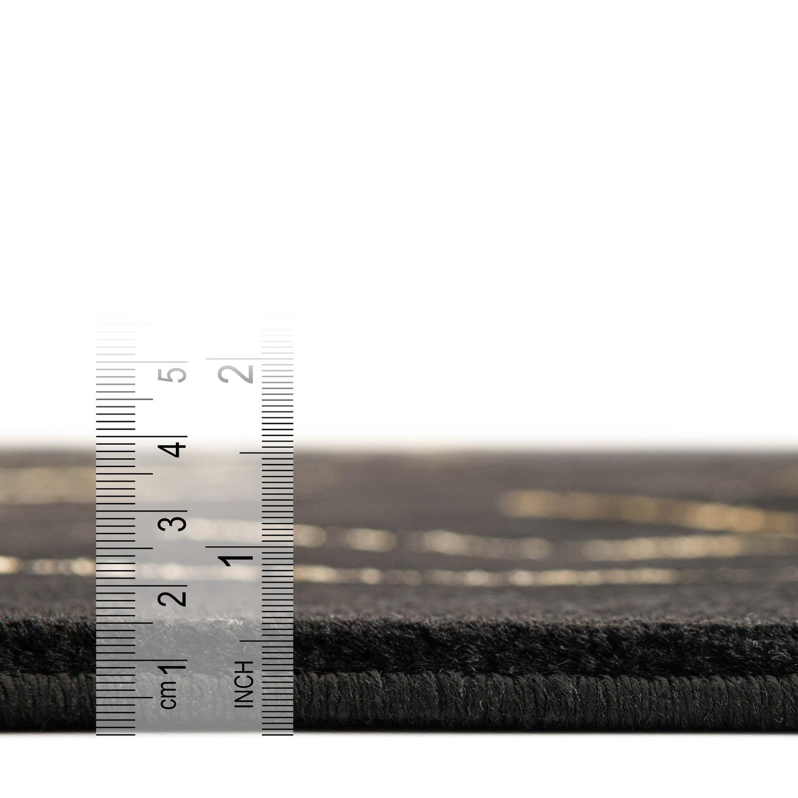 Machine-made from 70% polypropylene and 30% polyester, the rug has a dense, smooth pile that feels soft underfoot while holding the pattern with clear definition. Its contrast of matte black and warm gold makes it an easy anchor for a variety of interiors — pair it with black or brass-accented furniture and velvet upholstery for a glam living room, tuck it beneath a sleek coffee table in a contemporary lounge, or use it to ground a dining area with mirrored, lacquered, or dark-wood furnishings. It also works well in entryways or home offices where a striking, organized pattern can bring structure to the space.