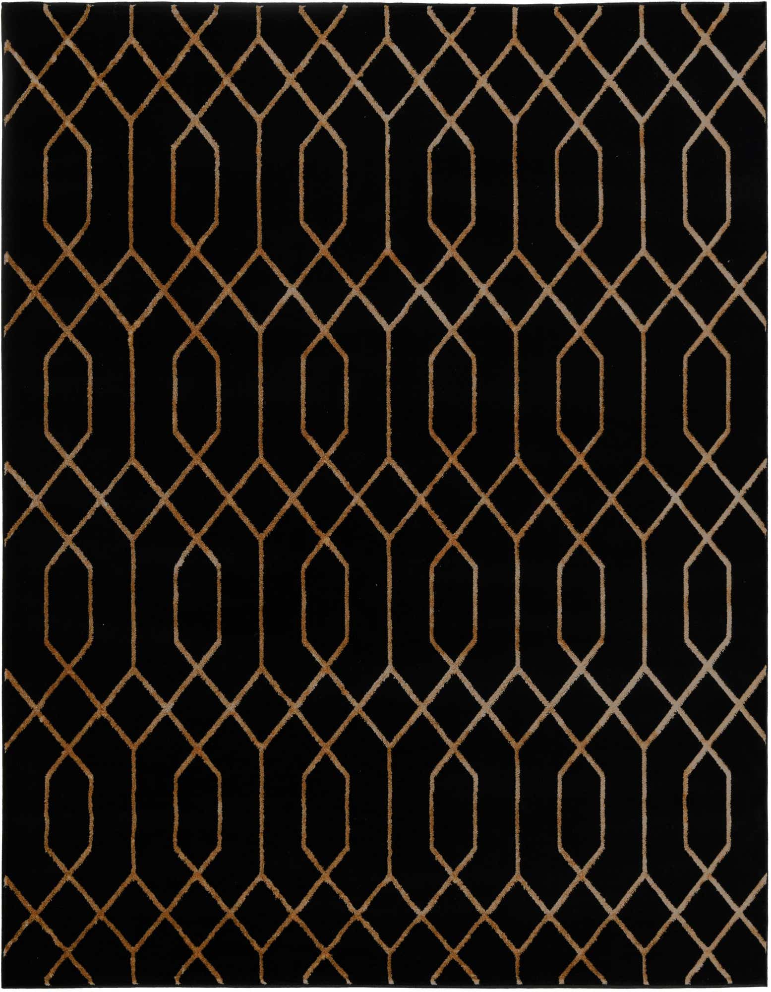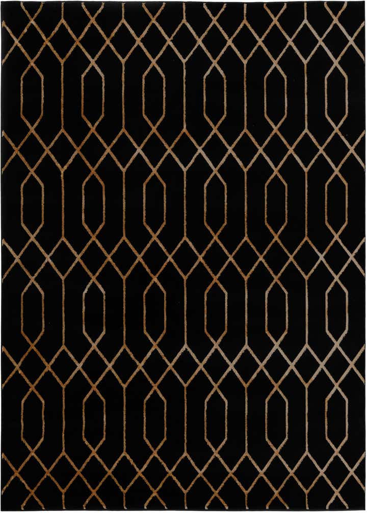 A bold black field forms the backdrop for a repeated gold trellis motif, where elongated octagonal links create a steady, geometric rhythm across the surface. The metallic-gold lines sit crisp and even against the deep black, giving the rug a modern, refined look that reads both architectural and decorative. The pattern is straightforward and balanced, providing visual interest without competing with other design elements.