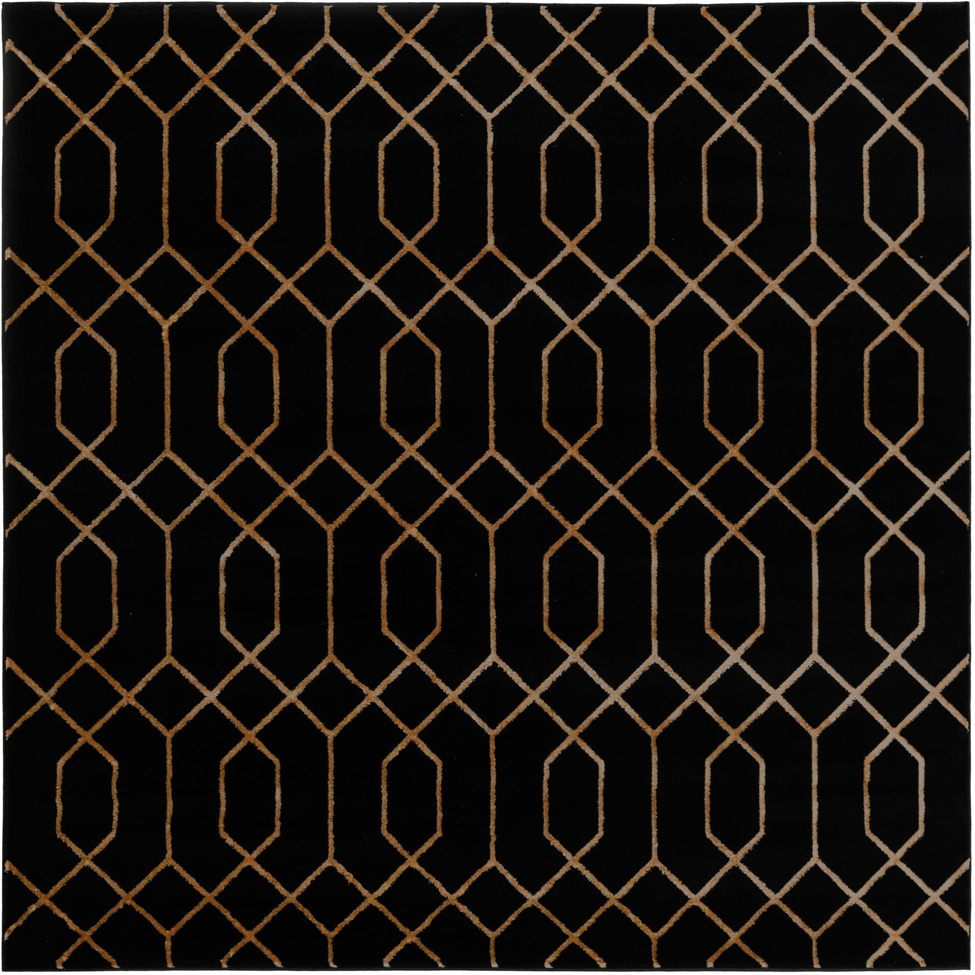 A square black rug with a repeating modern geometric trellis pattern in gold, suitable for a living room or patio.