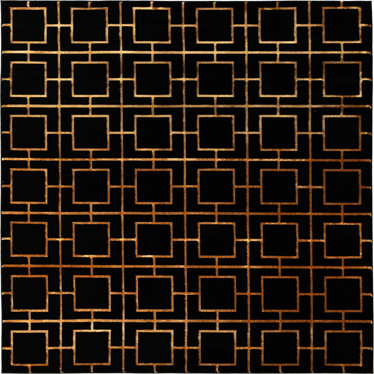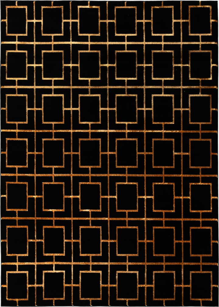 A bold geometric trellis of repeating squares and intersecting lines in warm gold sits atop a deep black field to create a clean, structured look with an Art Deco influence. The gold motif carries a soft, light-reflective quality against the matte black background, giving the pattern depth without added ornamentation. Machine made from 70% polypropylene and 30% polyester, the rug has a low-profile, soft pile that feels smooth underfoot while the polyester yarn adds a subtle sheen to the gold lines.