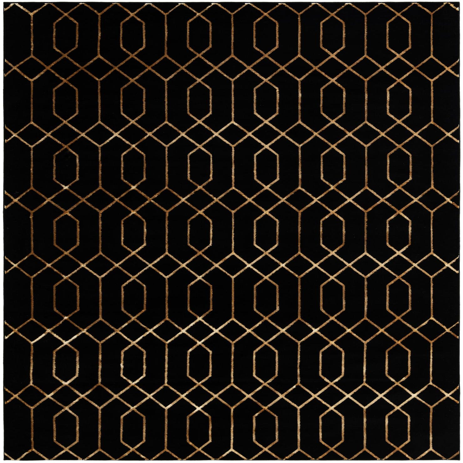 A 9x12 rectangular black area rug with a modern gold geometric trellis pattern, suitable for a living room.