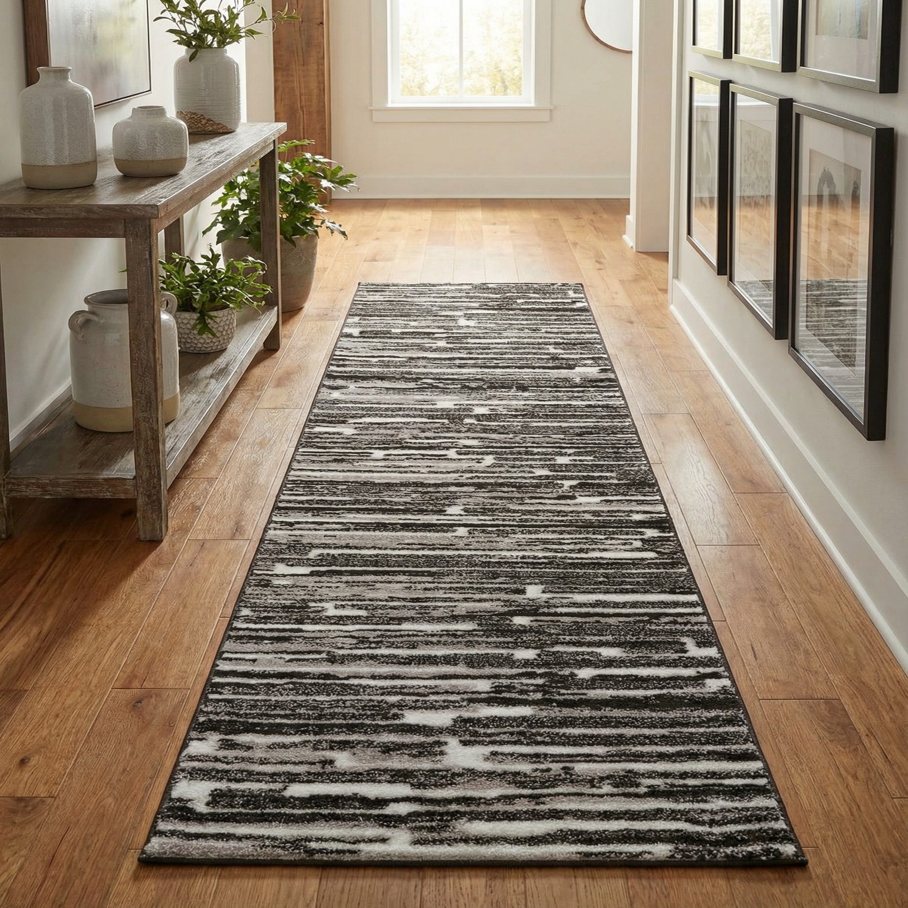 A 10 ft runner rug in black, ivory, and grey with a modern abstract striped pattern, ideal for a hallway.