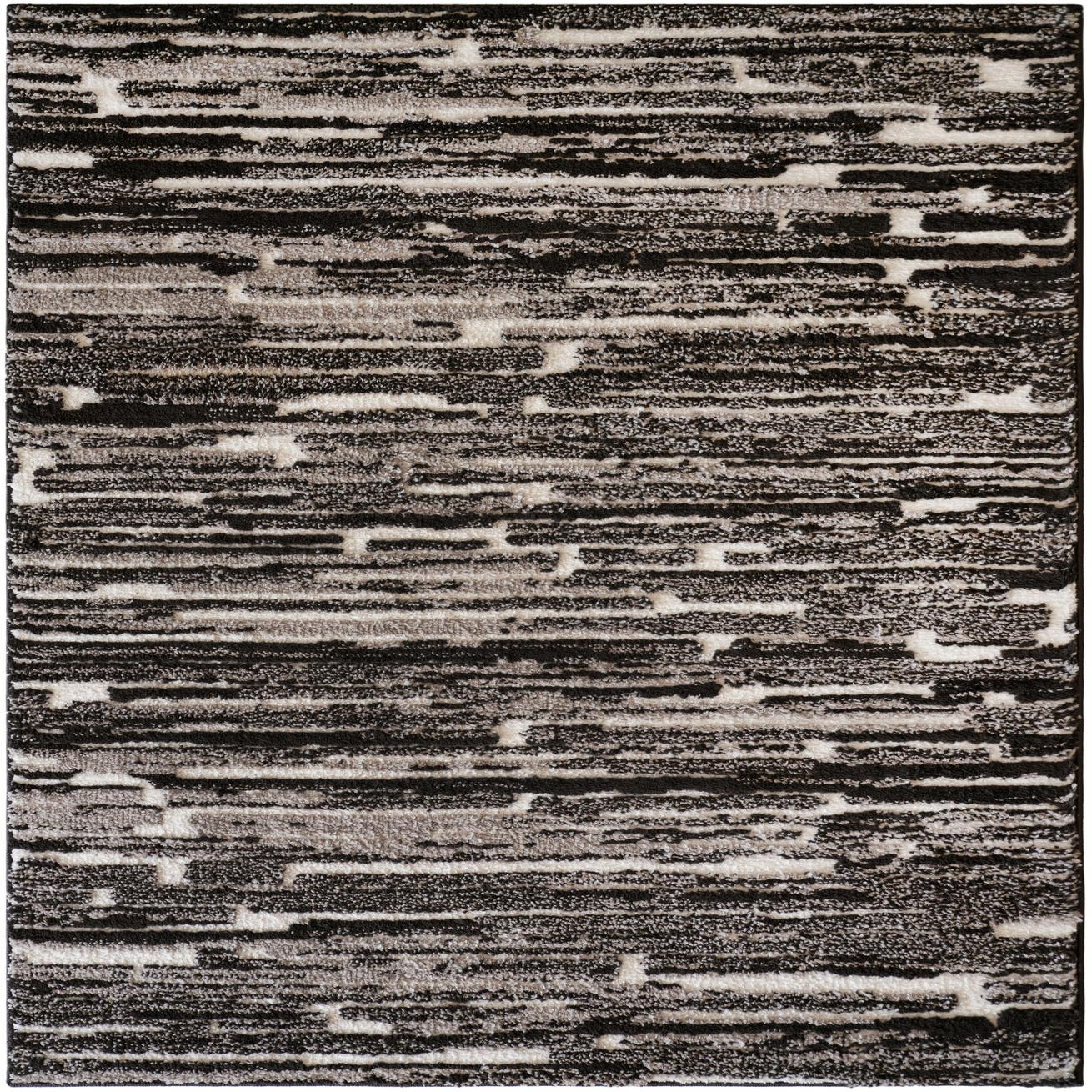 Machine-made from polypropylene and polyester, this rug has a low-to-medium pile with a soft but structured hand that invites bare feet while showing clear surface definition. A horizontal, abstract striation pattern stretches across a Black and Ivory background, layered with Gray and charcoal tones to create a distressed, linear effect that adds movement and depth without strong contrast.