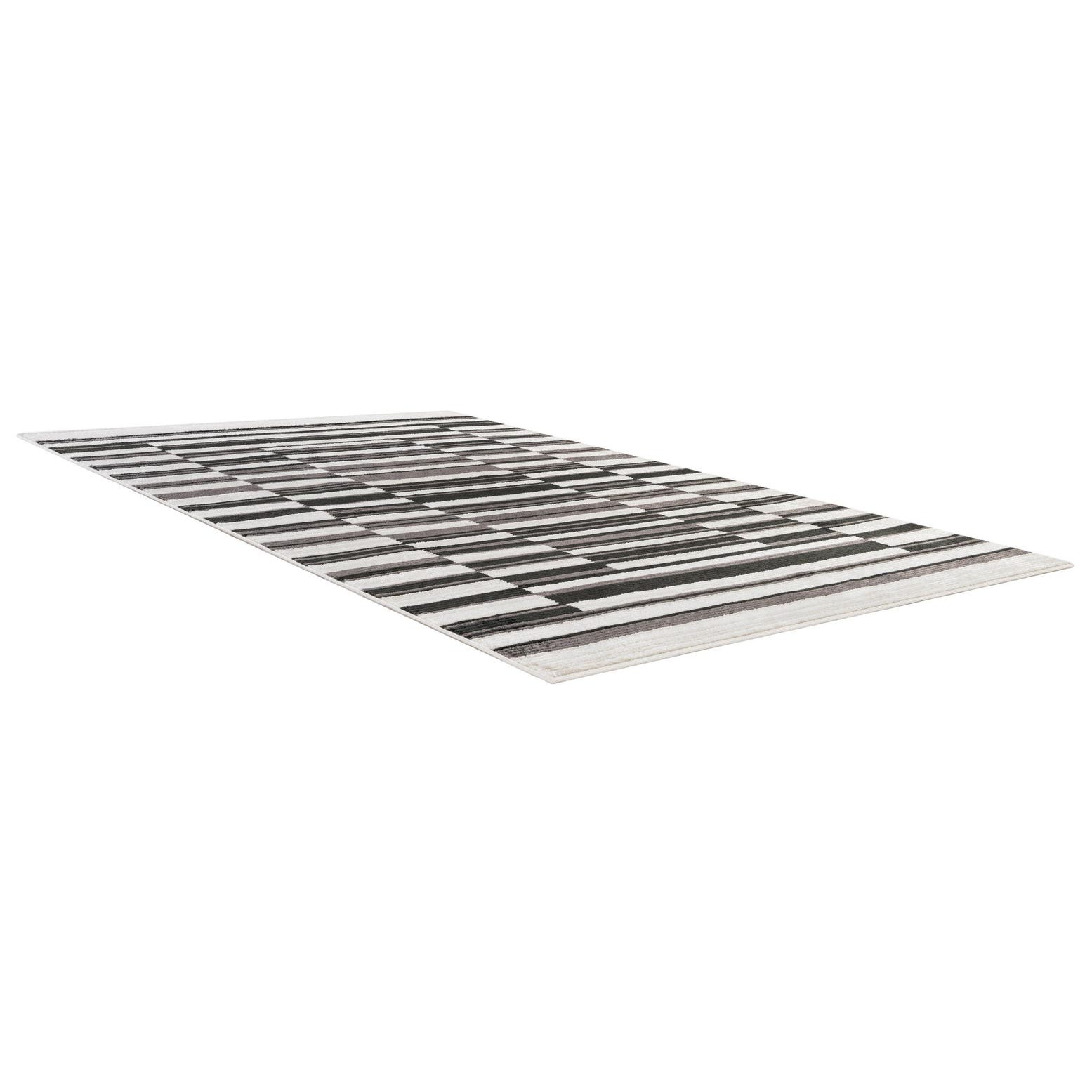 Clean, modern geometry shapes a bold black-and-ivory background with stacked horizontal bands in varying shades of gray. Narrow and wide stripes are arranged in a stepped, rectilinear pattern that creates visual depth without overwhelming the room. The surface has a ribbed, slightly raised texture from alternating pile heights, giving the rug a tactile, sculpted feel you can notice when you run your hand across it. Machine made of 100% polypropylene, the construction produces consistent color and pattern across the piece.