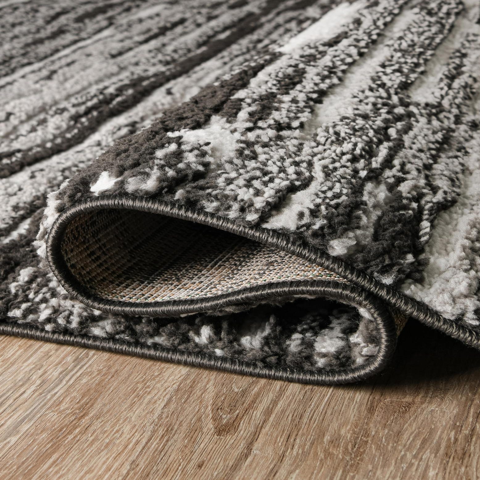 A bold linear pattern of irregular horizontal striations gives this rug a contemporary, graphic look. The background is Black and Ivory, punctuated by Black and Gray bands that create a layered, almost hand-drawn effect across the surface. Machine made of polypropylene and polyester, the rug has a tactile, dimensional feel—raised areas contrast with lower, smoother sections so the pattern reads both visually and underfoot.