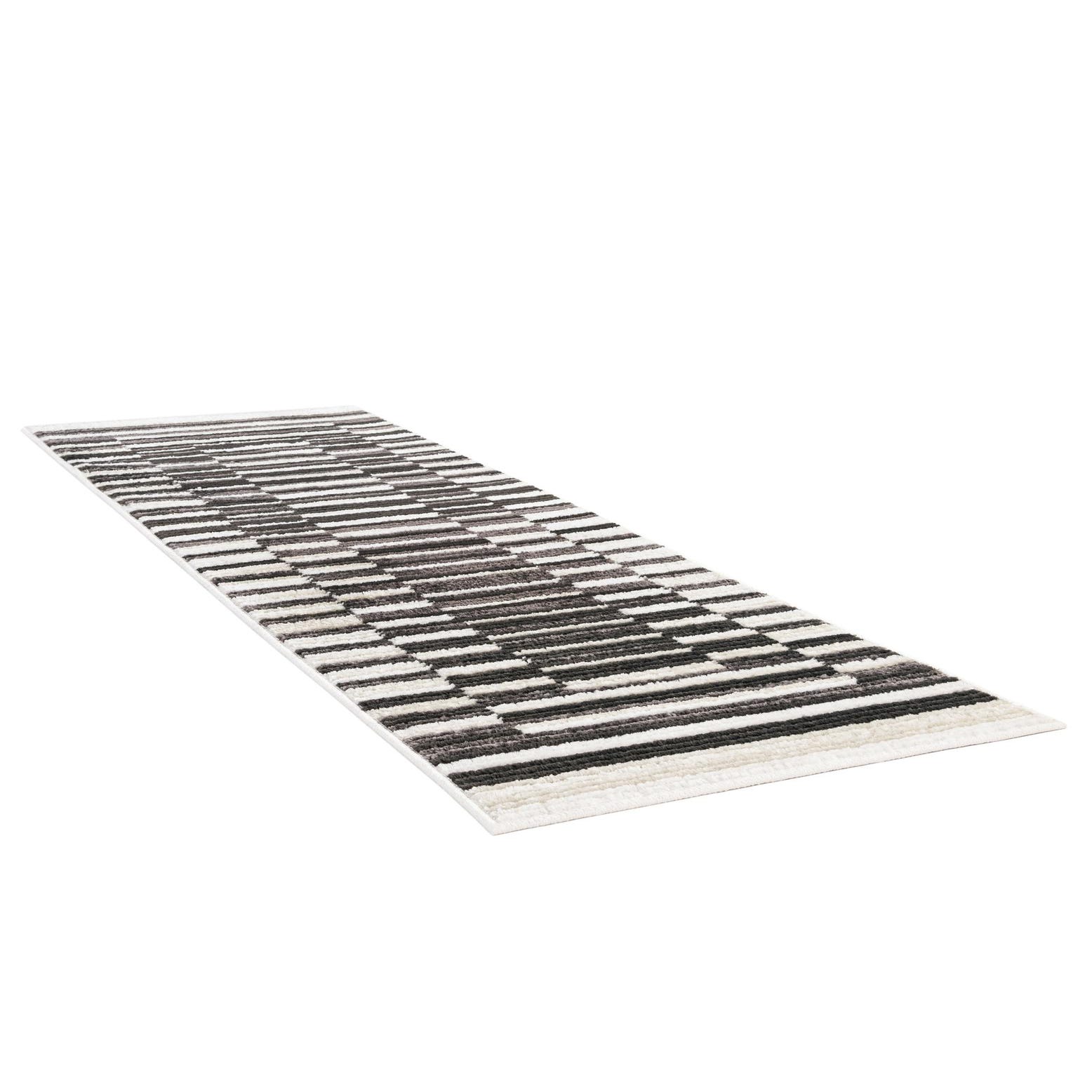 A 6 ft runner rug with a modern geometric pattern of alternating black, charcoal, and ivory horizontal stripes, creating a textured, dynamic look.