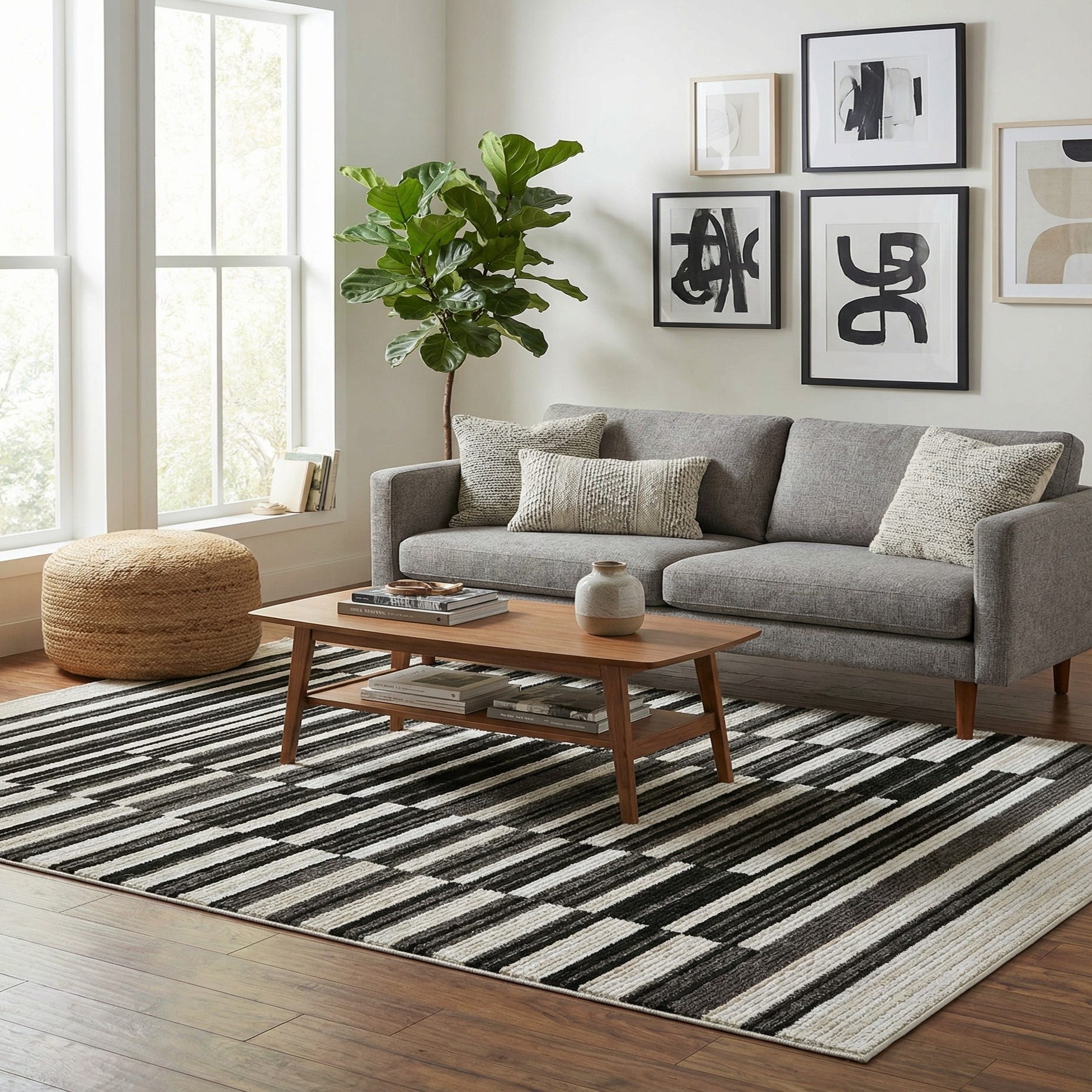 A 6x9 rectangular modern rug featuring a bold geometric stripe pattern in varying shades of black, charcoal, and ivory.