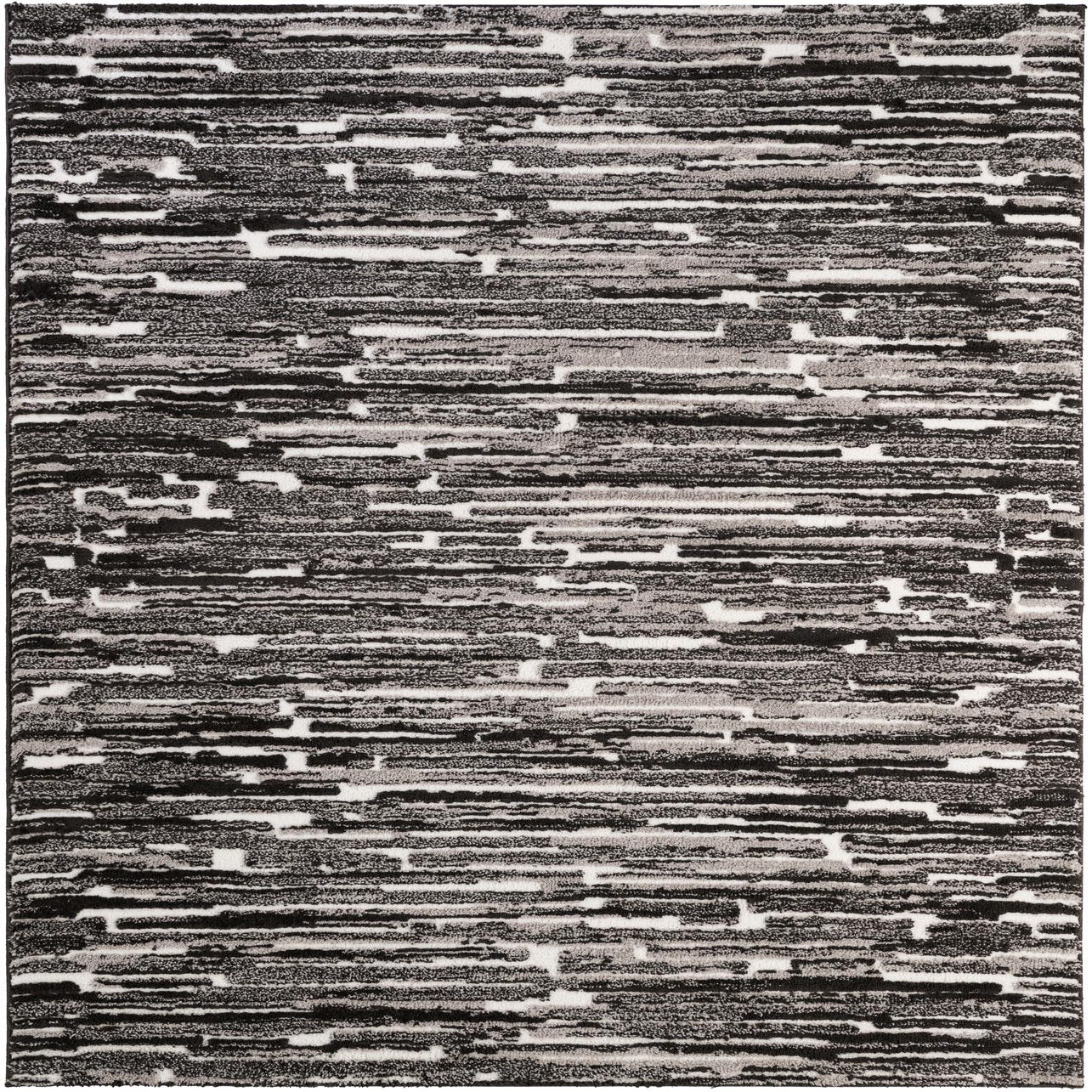 An abstract linear motif stretches across a black-and-ivory background, where irregular horizontal striations in black and gray create a layered, textured look. The pattern reads modern and graphic without feeling rigid — small breaks and variations in the lines give the surface visual movement and a handcrafted quality. Machine-made from polypropylene and polyester, the rug has a low-to-medium pile with a pleasantly soft, dense hand that holds the pattern edges cleanly while offering a subtle, tactile cushion underfoot.