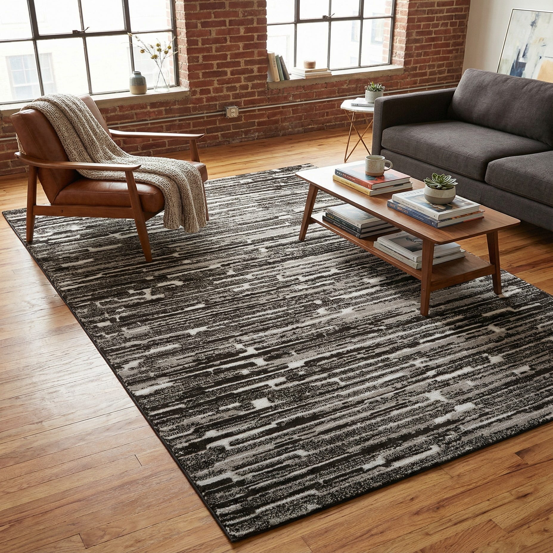 This monochrome palette and contemporary pattern suit a range of interiors: place it beneath a living room seating group to anchor neutral upholstery, pair it with warm wood furniture and black metal accents in an industrial loft, or use it in a minimalist home office to add visual interest without overwhelming the space. It also layers nicely over hardwood or tile and complements leather sofas, concrete floors, and textured textiles for a pulled-together, modern look.