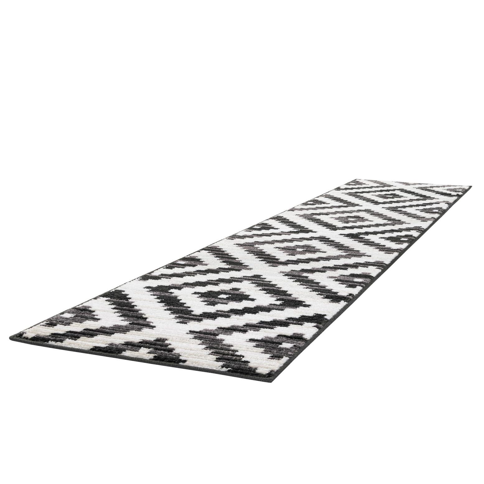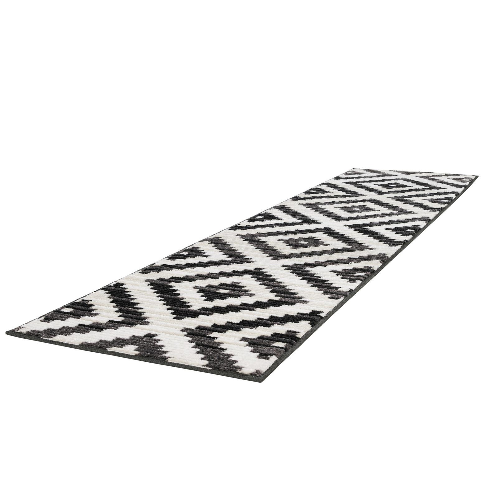 A black and ivory runner rug with a bold geometric diamond pattern, featuring a textured medium pile.