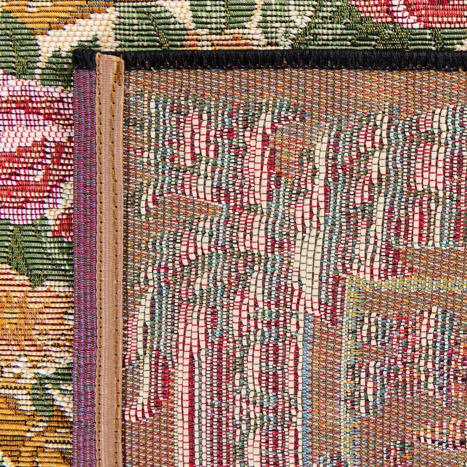 Colors intricately woven into the design include a rich palette of black, ivory, brown, gold, green, red, and pink, creating a visual narrative that is both classic and inviting. The texture of this rug is consistent with flatweave construction, providing a smooth surface that caters to a variety of outdoor settings.