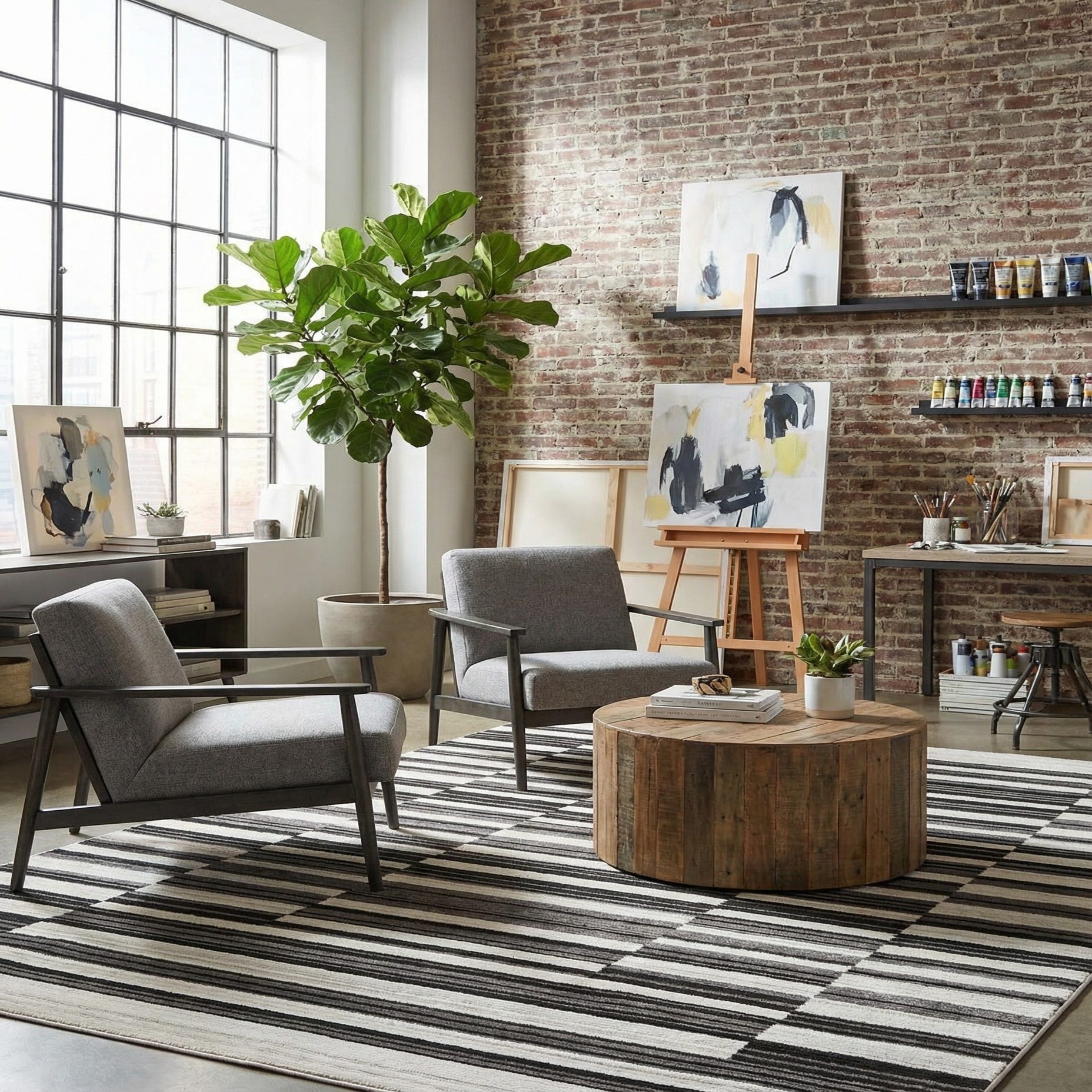 A 9x12 rectangular rug featuring a bold geometric pattern of alternating black, charcoal, and ivory horizontal stripes, forming a large central rectangle.