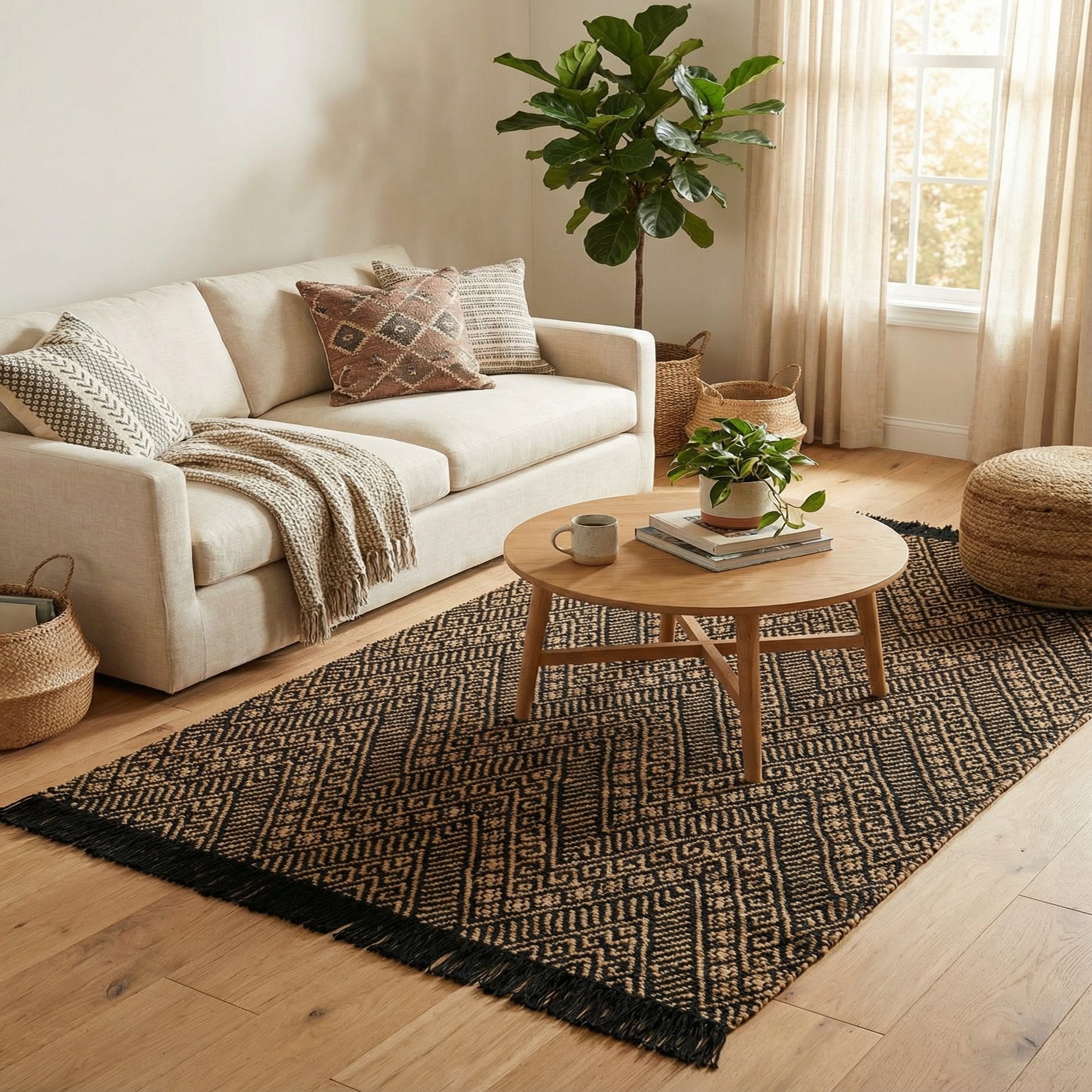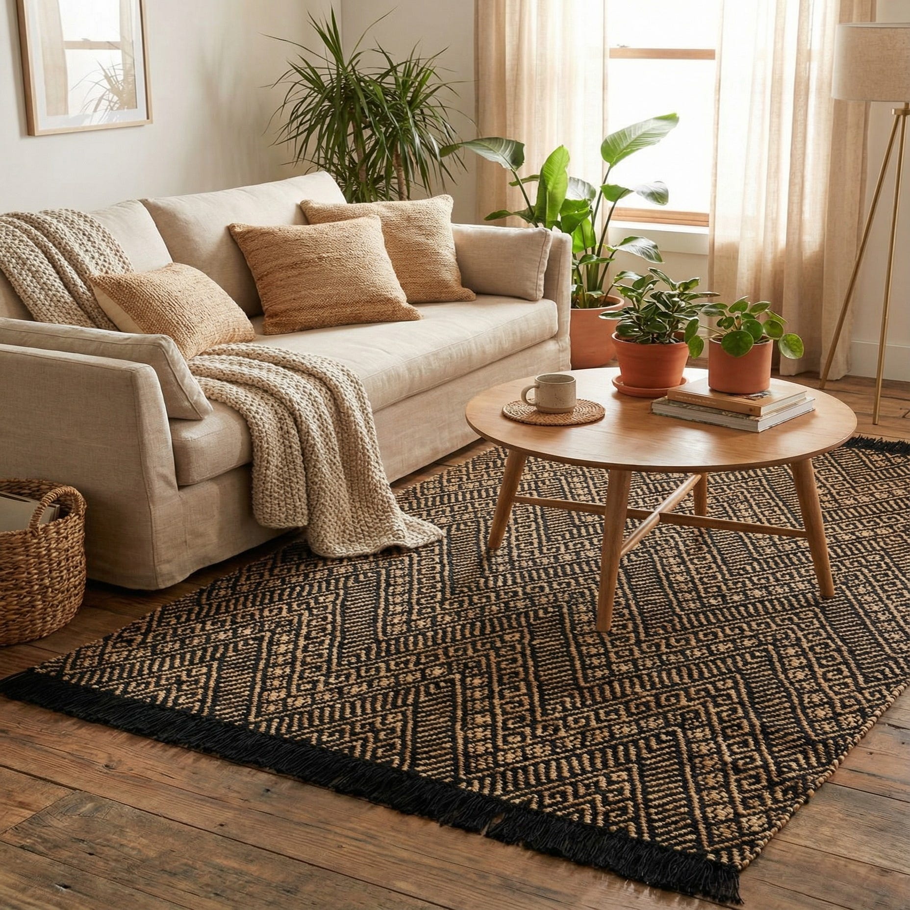 A 4x6 rectangular Braided Jute rug in black and natural tan, featuring a modern geometric pattern and fringed edges.
