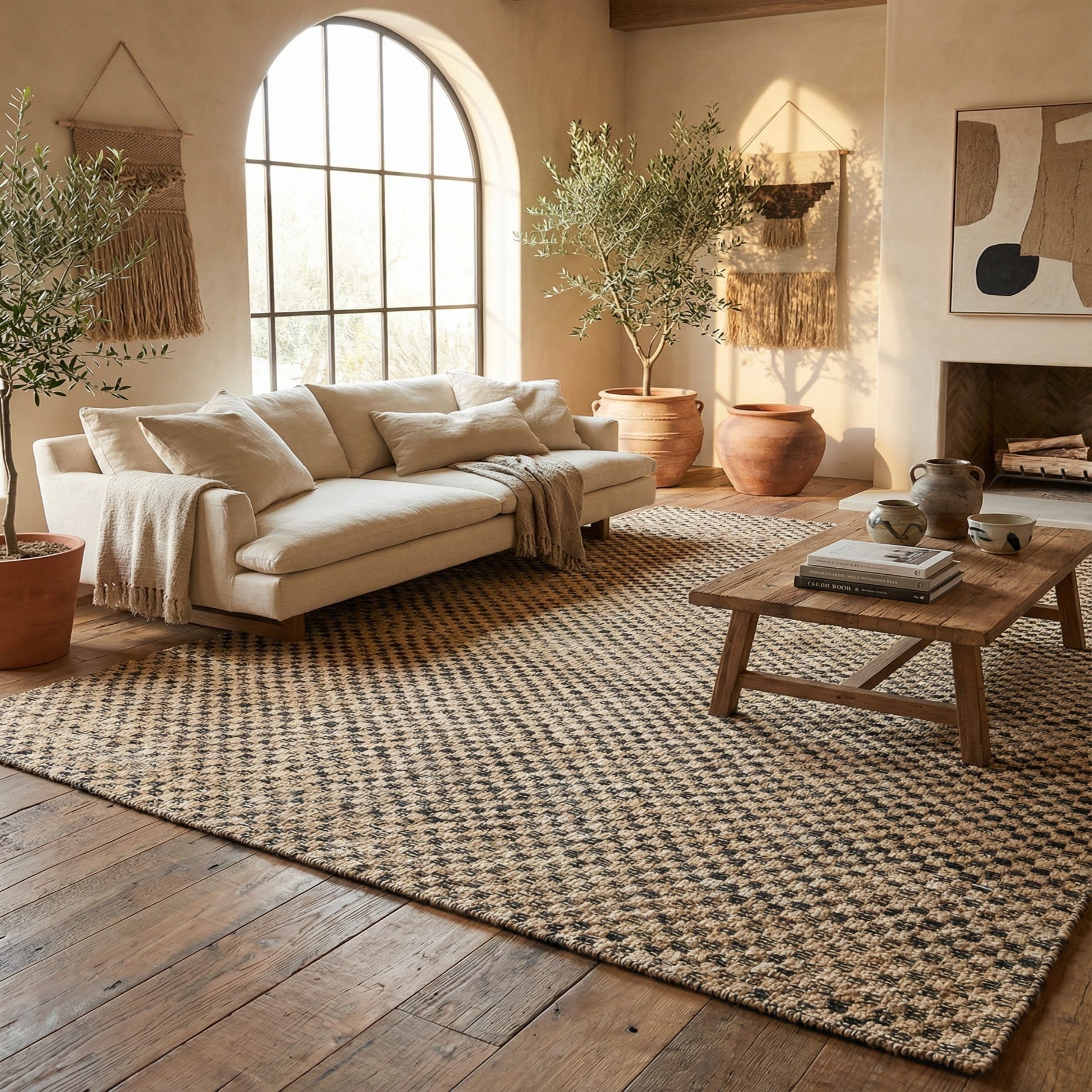 This rug works well in living rooms, dining areas, or entryways where you want texture and pattern without overwhelming the space. Pair it with warm wood furniture and leather seating for a modern-rustic scheme, layer it beneath a simple black metal table for an industrial touch, or combine it with light linens and natural greenery for a relaxed, coastal-inspired room. Its neutral palette and tactile weave make it an easy anchor for both minimalist and eclectic interiors.