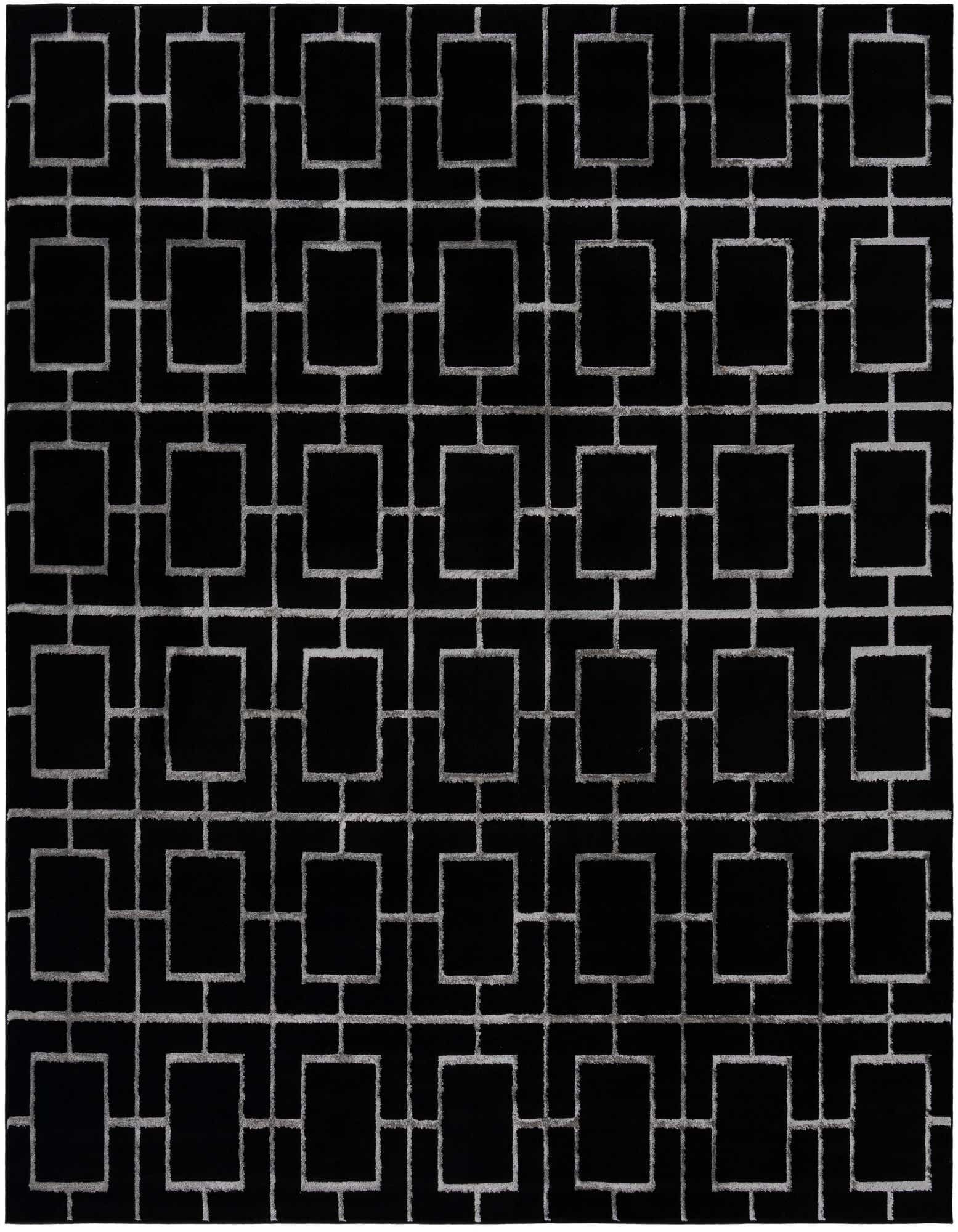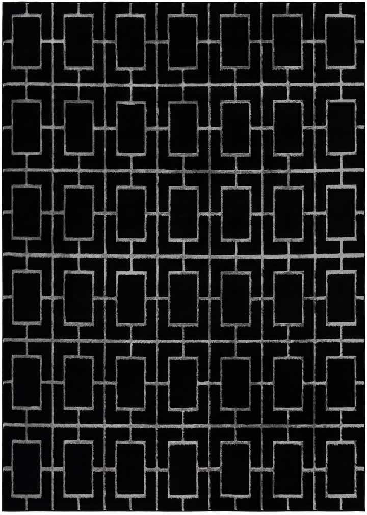 A bold geometric trellis of silver rectangles crosses a deep black field, the repeated grid creating a modern, Art Deco-inspired rhythm. The silver lines have a softly brushed edge that gives the pattern a hand-drawn, textured look against the dark background. Running your hand across the surface reveals a low-to-medium pile with a gentle sheen—polyester highlights catch the light while the polypropylene body provides a tactile, resilient feel. Machine made of 70% Polypropylene and 30% Polyester, the construction keeps the pattern crisp and the surface comfortable underfoot.