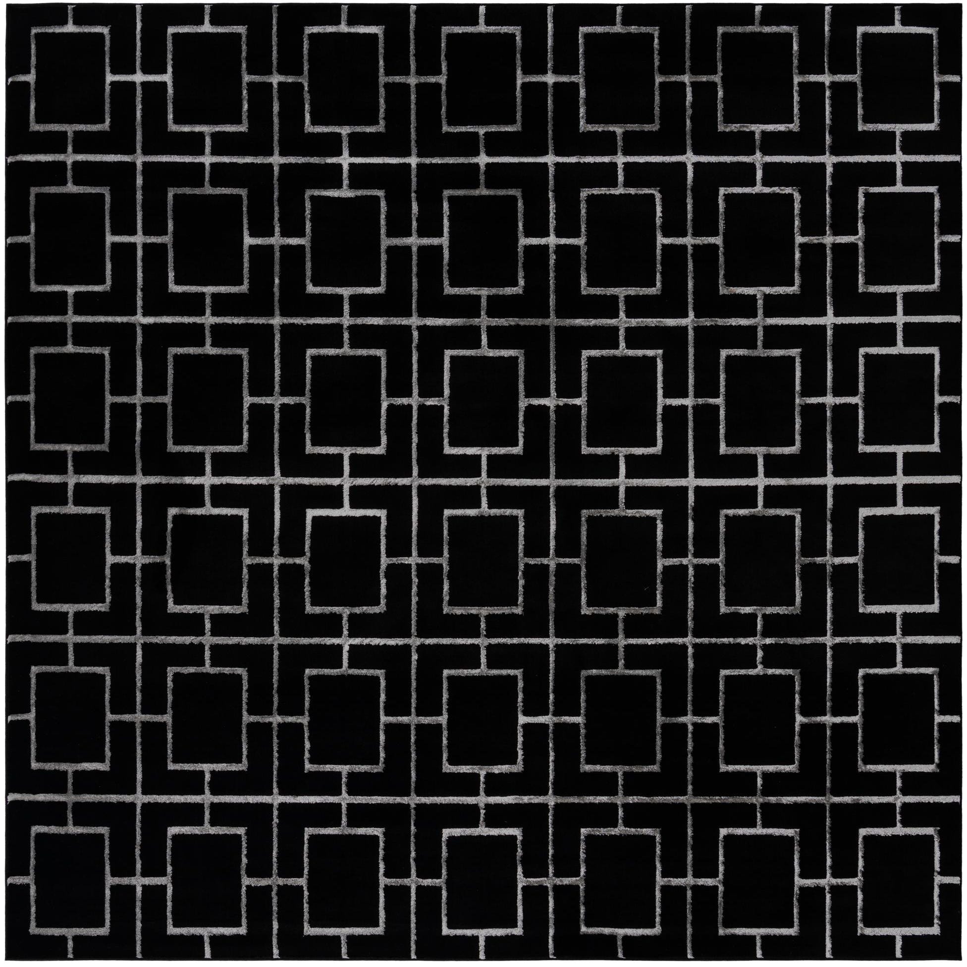 A 10'x10' square black rug featuring a bold silver modern geometric trellis pattern, ideal for a contemporary living space.