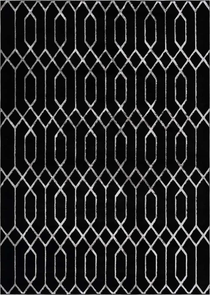 A bold, modern trellis of silver lines traces a repeating lattice of elongated octagons and diamond knots across a deep black field. The high-contrast pattern is graphic and precise: the silver pile catches light with a subtle sheen while the black background holds a denser, matte feel. Machine-made construction of 70% polypropylene and 30% polyester gives the surface a low, velvety hand and clear pattern definition that feels smooth underfoot.