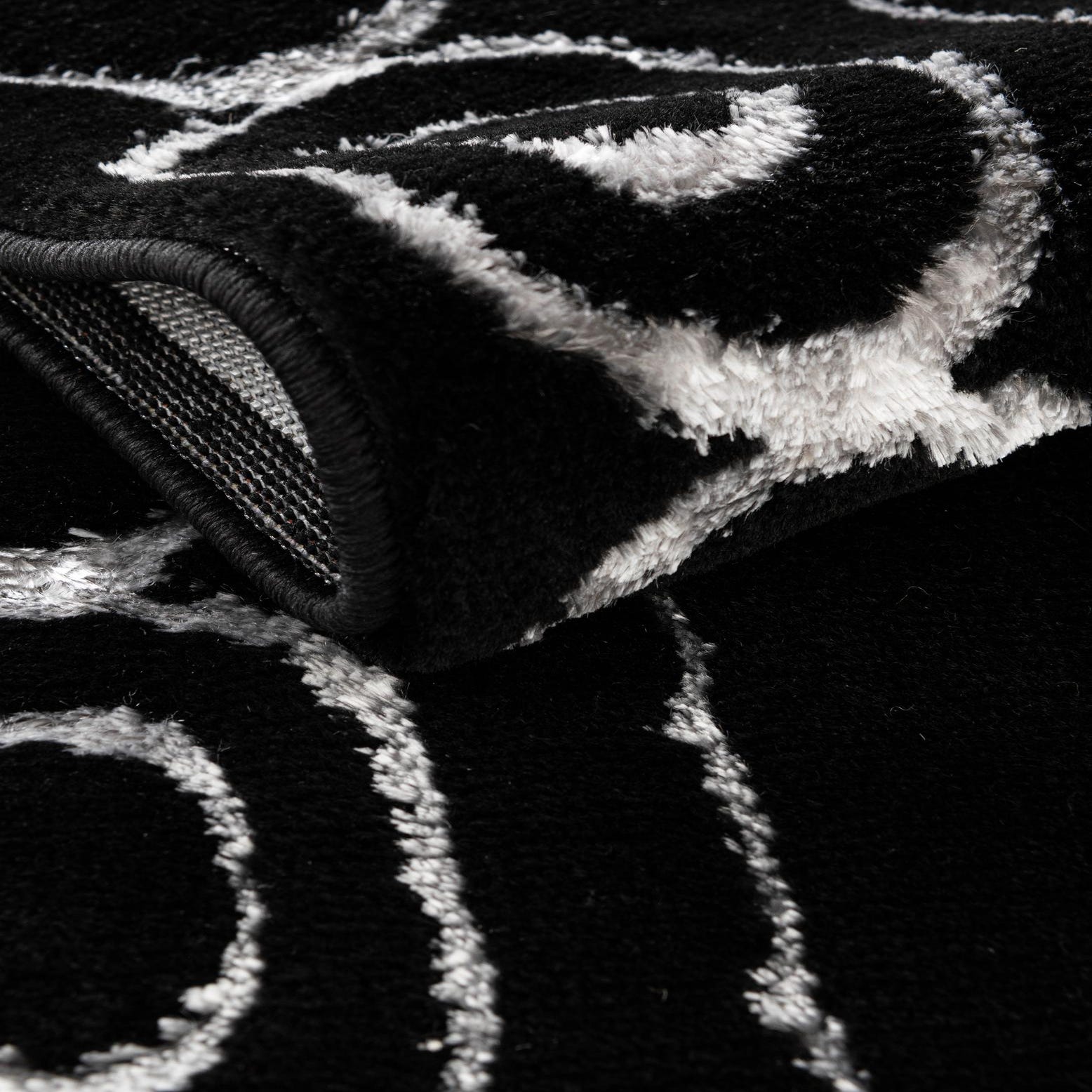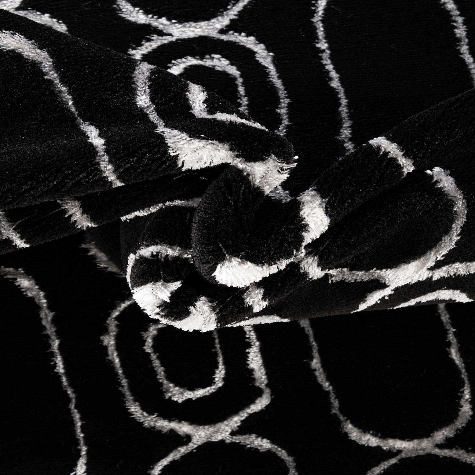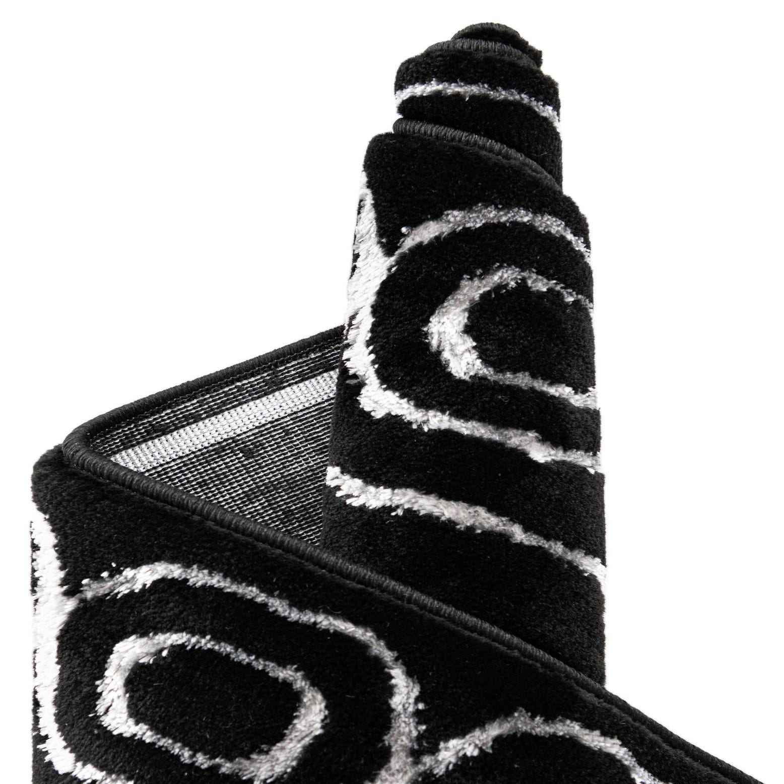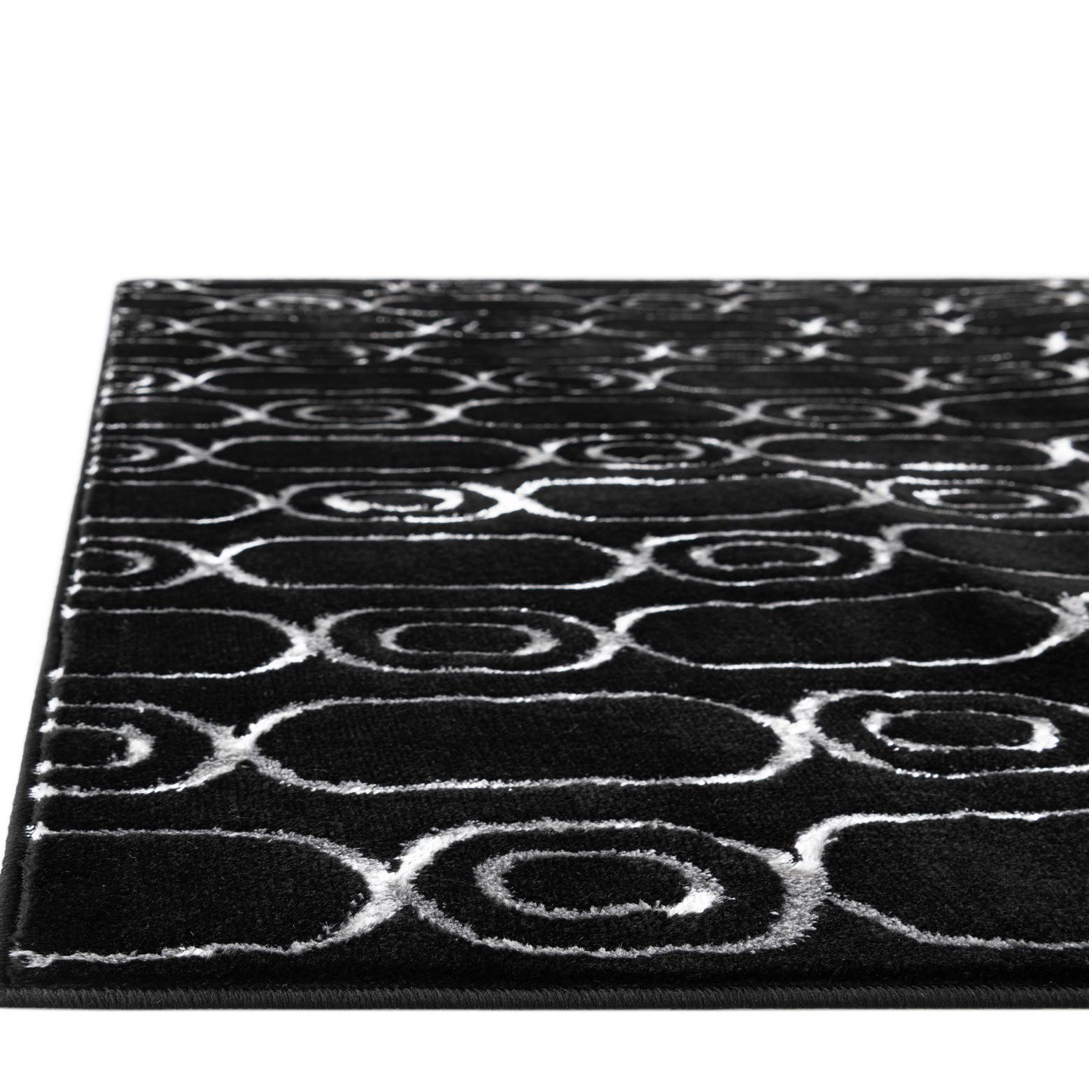 A graphic, modern pattern of linked elongated ovals and concentric rings in metallic silver sits crisply against a deep black ground, creating a structured, rhythmic look that reads both contemporary and refined. The silver motif has a slightly hand-drawn edge that adds visual texture and movement across the field, while the strong contrast between the polished silver and the black background gives the rug a bold, architectural presence.