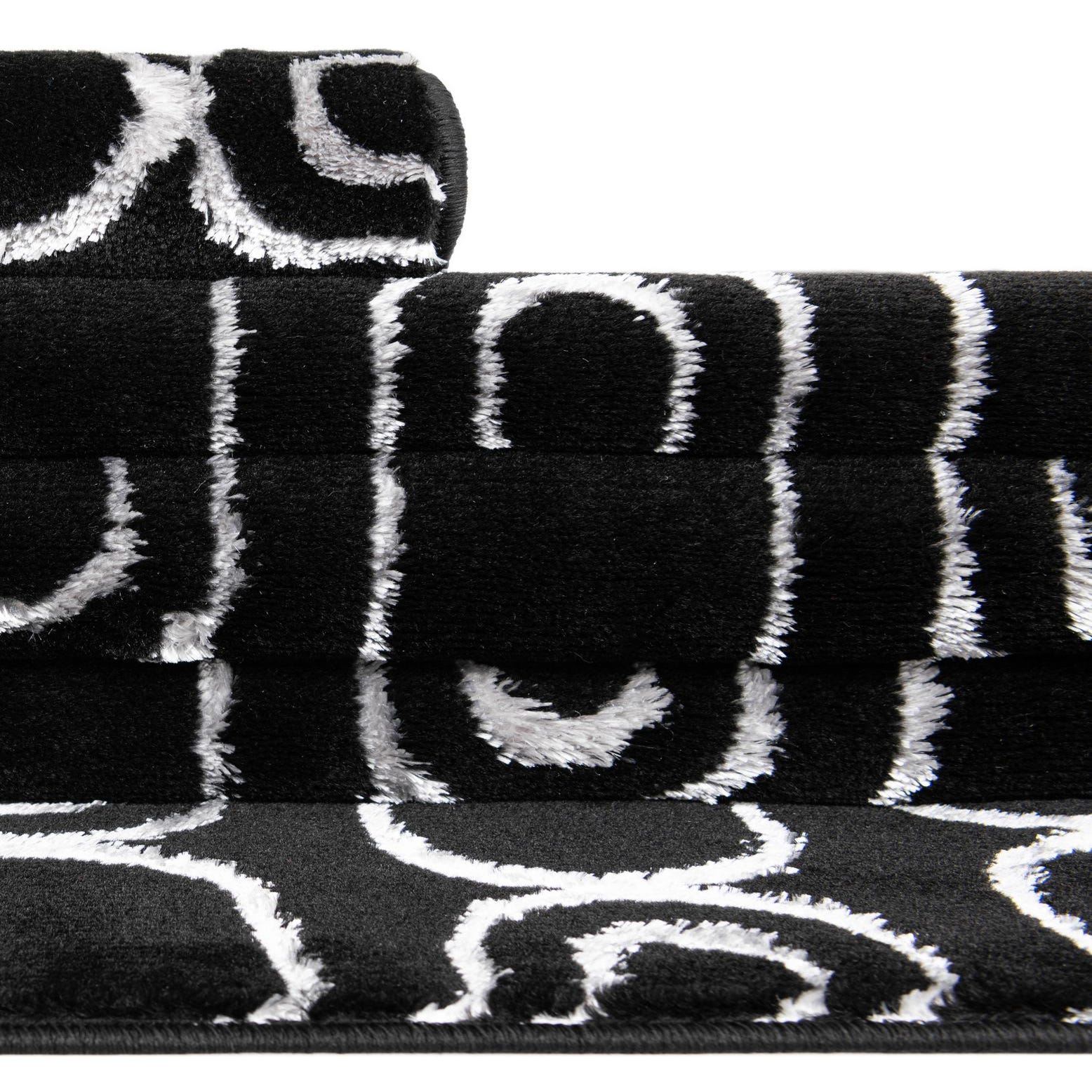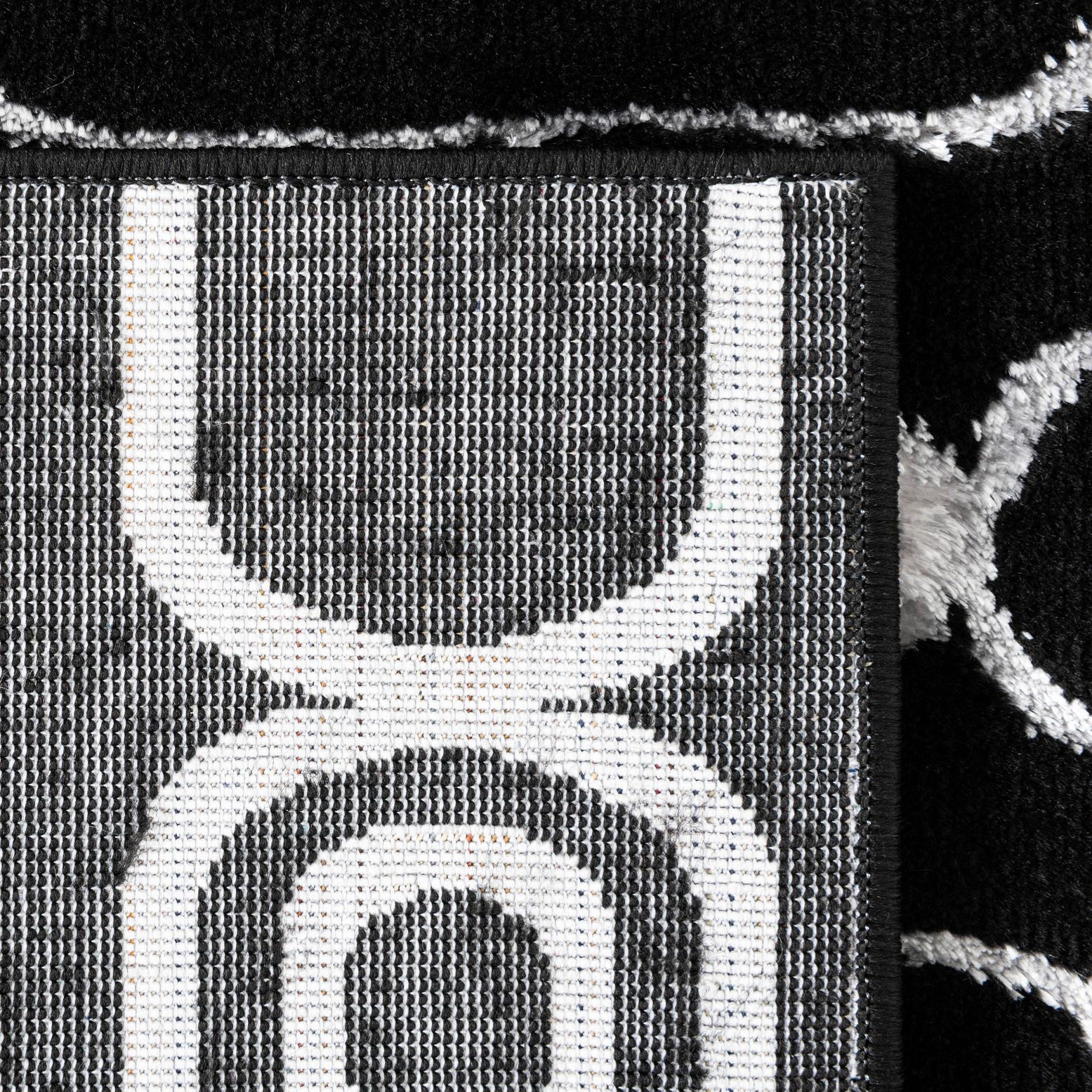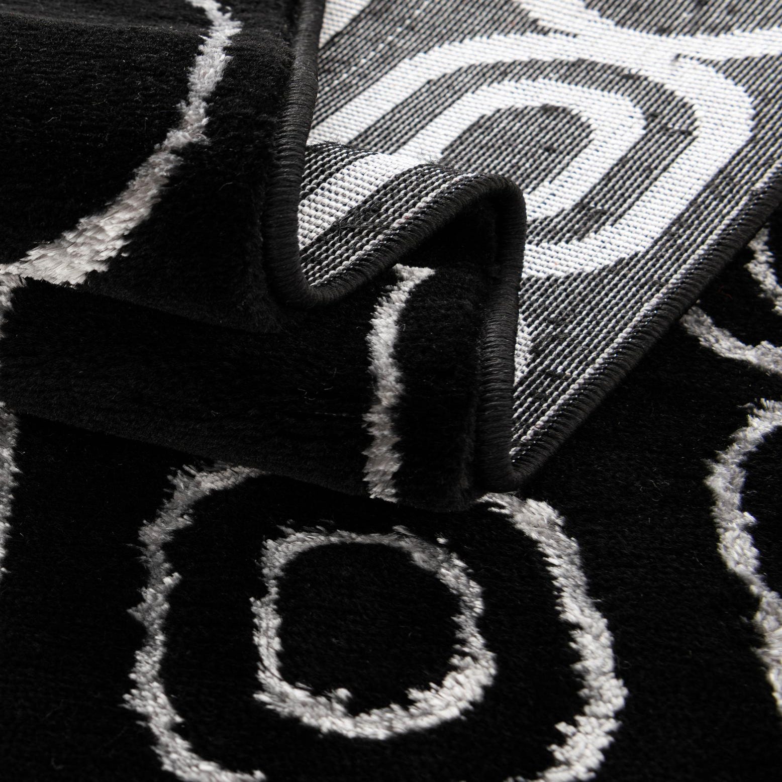 A black and silver square rug with a repeating geometric chain link pattern, suitable for a modern living space.