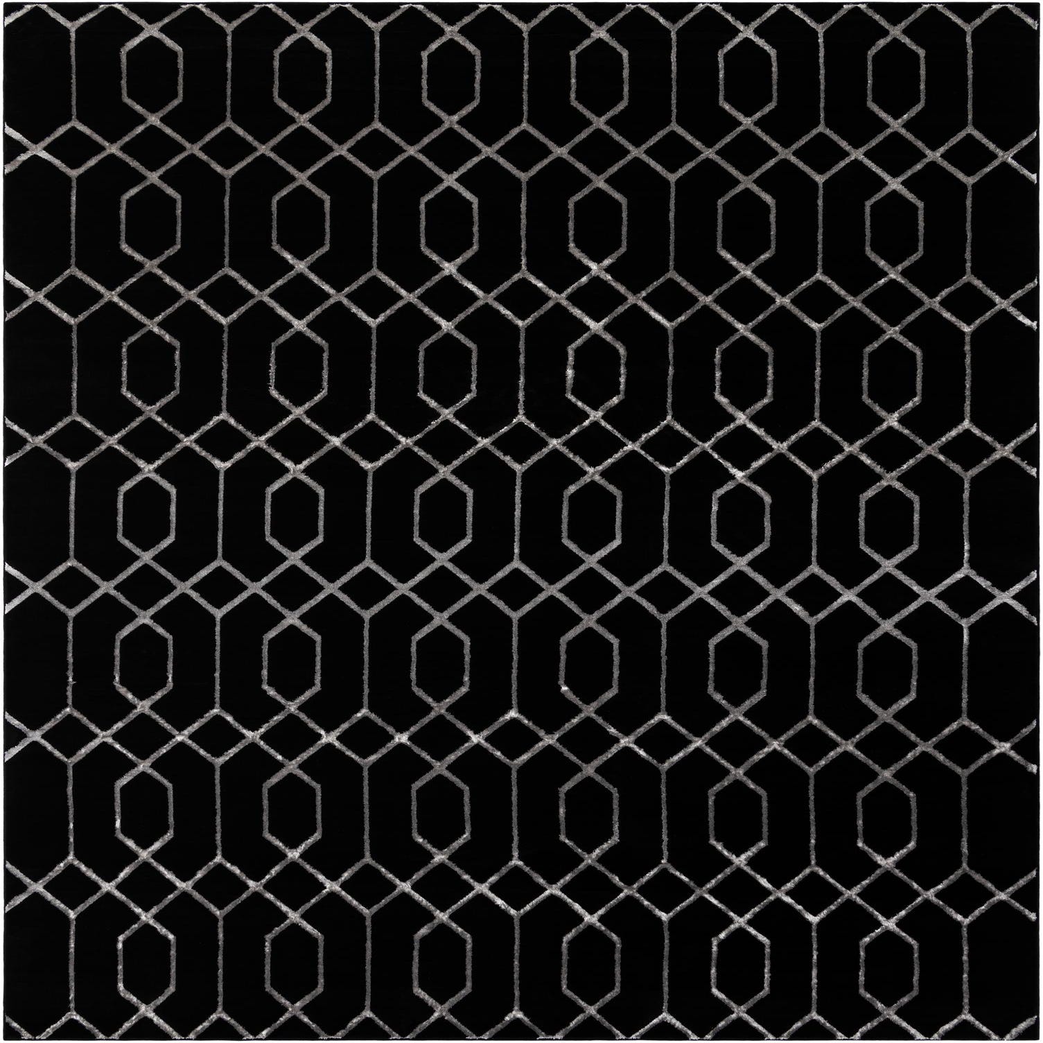 A 10x13 rectangular black and silver modern area rug featuring a repeating geometric trellis pattern.