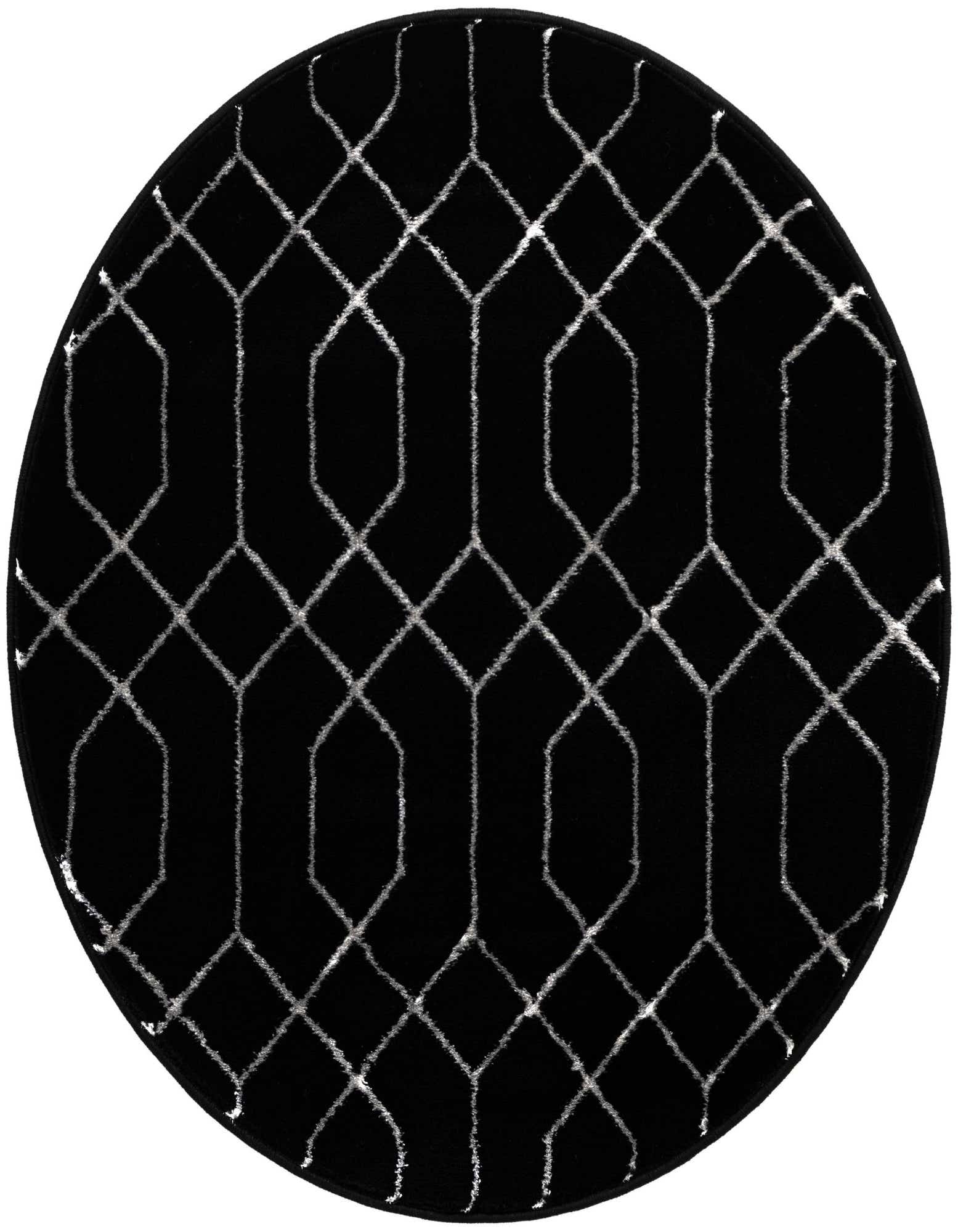 A round black rug with a silver modern trellis pattern, featuring a textured, medium pile.