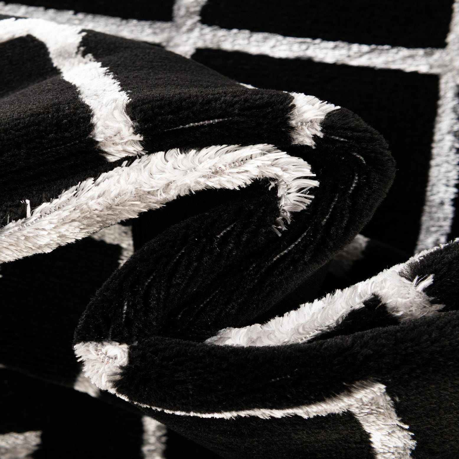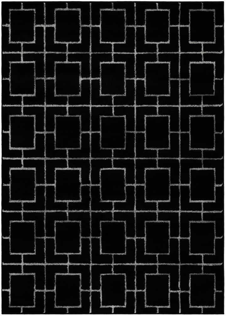 Bold geometric trellis work gives this rug a modern, glamorous feel. Rectangular motifs are linked in a repeating grid, the metallic silver outlines set against a deep black field for a high-contrast graphic look. The pile has a low-profile, velvety hand where the black areas feel smooth and the silver lines offer a slight sheen and tactile variation, the result of a machine-made construction in 70% polypropylene and 30% polyester.