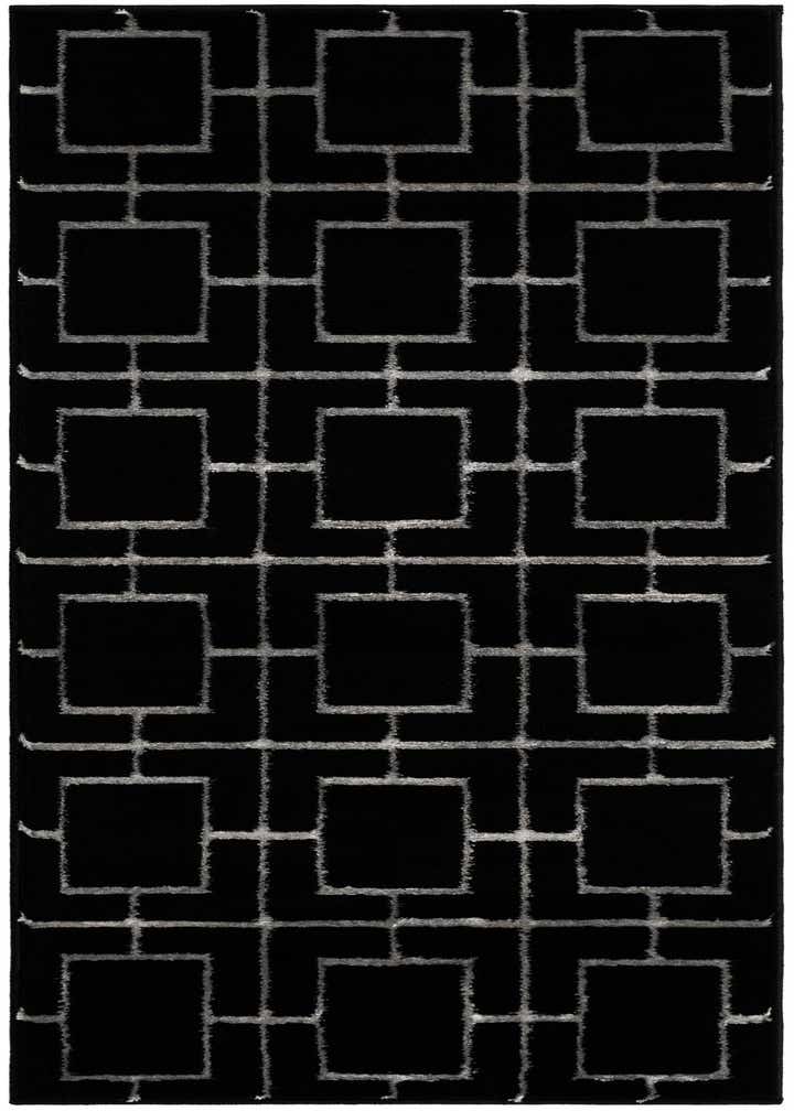 A bold geometric trellis lays across a deep black field, formed by a grid of linked rectangular motifs in metallic silver. The silver lines sit slightly raised against the velvety black background, creating a tactile contrast you can feel underfoot and a soft, light-catching sheen from the polyester content. Machine made from 70% polypropylene and 30% polyester, the rug has a dense, low-pile surface that reads modern and structured while still offering a comfortable, smooth touch.