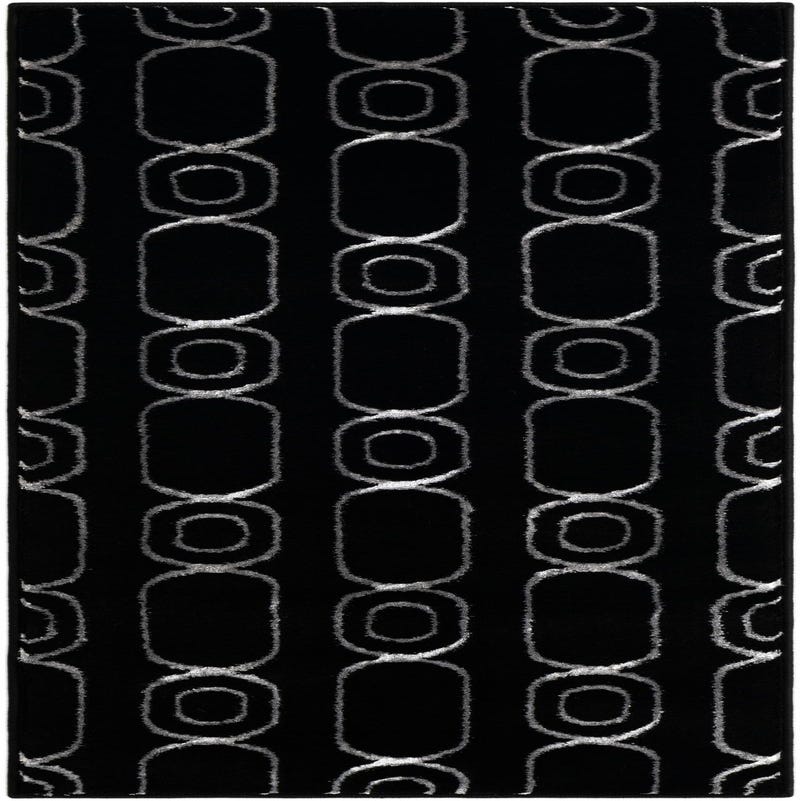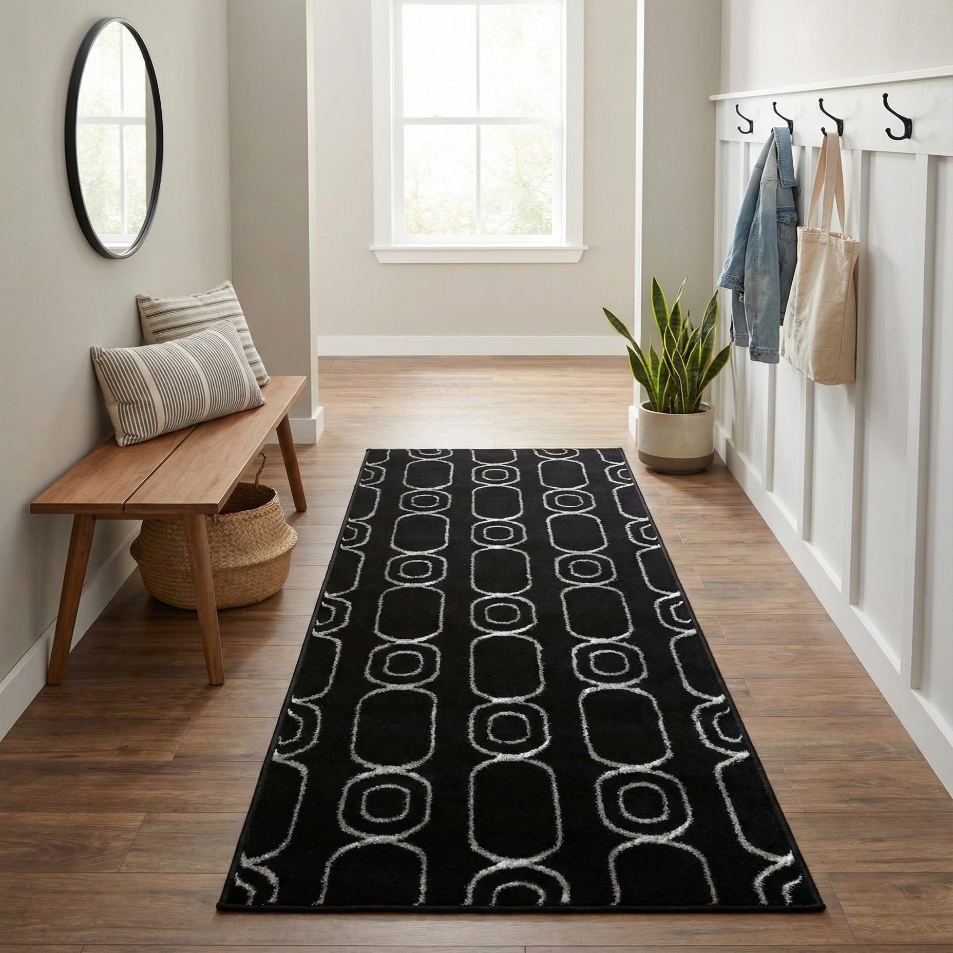 A 5 ft runner rug with a black background and silver geometric chain-link pattern, ideal for a hallway.
