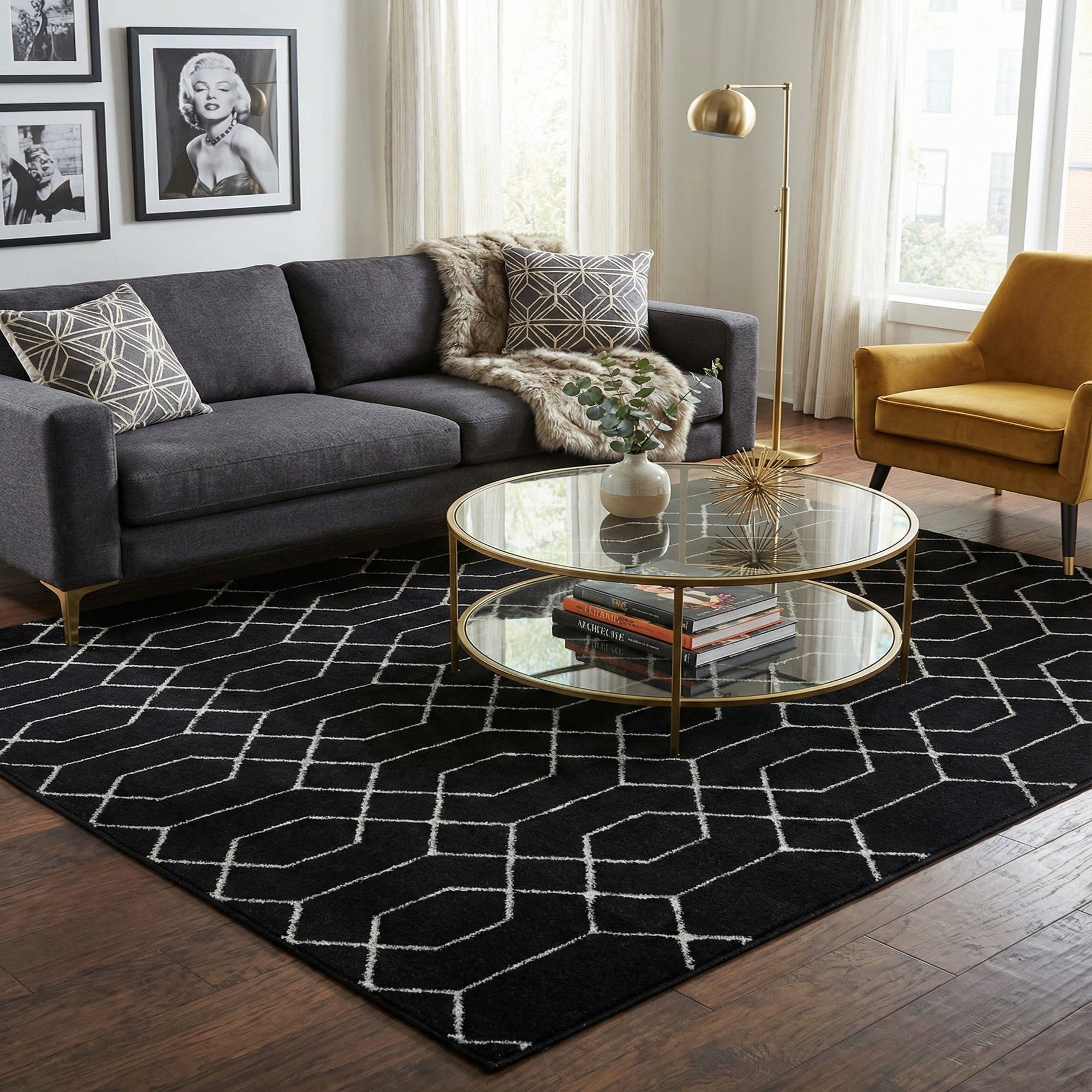 This design works well in modern and contemporary interiors where high-contrast accents are desired — try it to anchor a living room with light upholstery and chrome or glass furnishings, or place it under a sleek dining table to add graphic interest. It also pairs nicely with a glam bedroom scheme, metallic accents, or a monochrome home office to introduce pattern without overpowering the space.