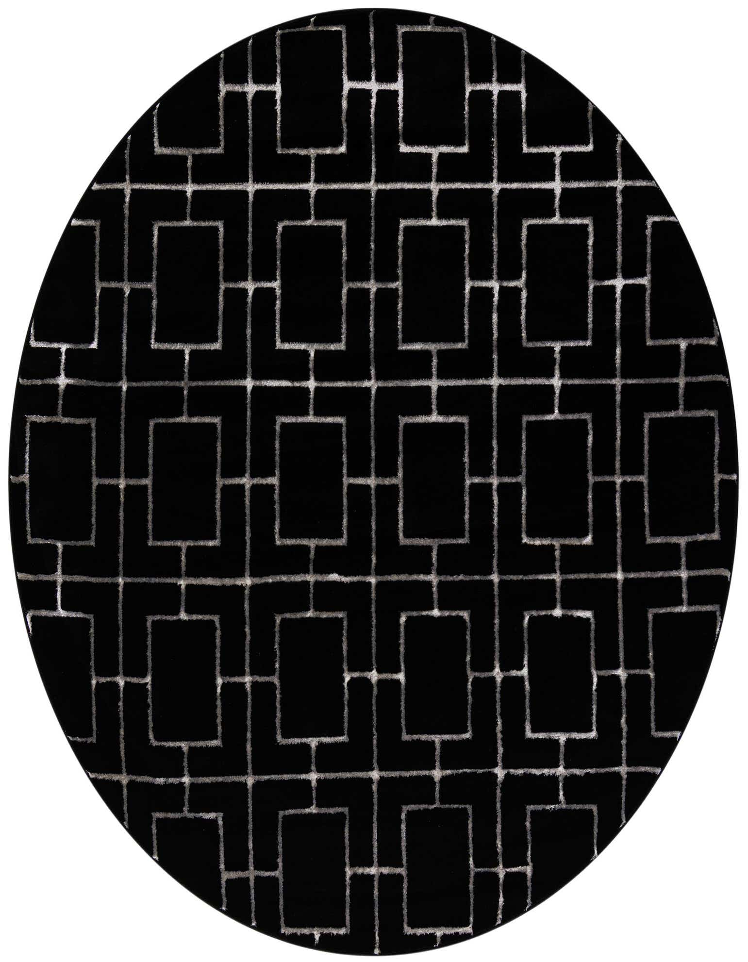A round 6' black and silver rug featuring a modern geometric trellis pattern, suitable for indoor spaces.