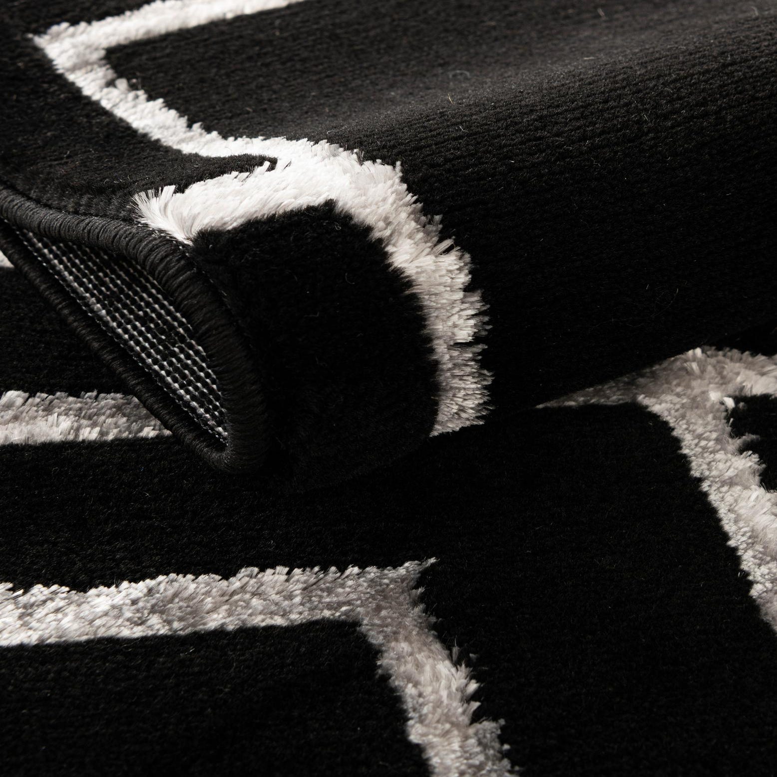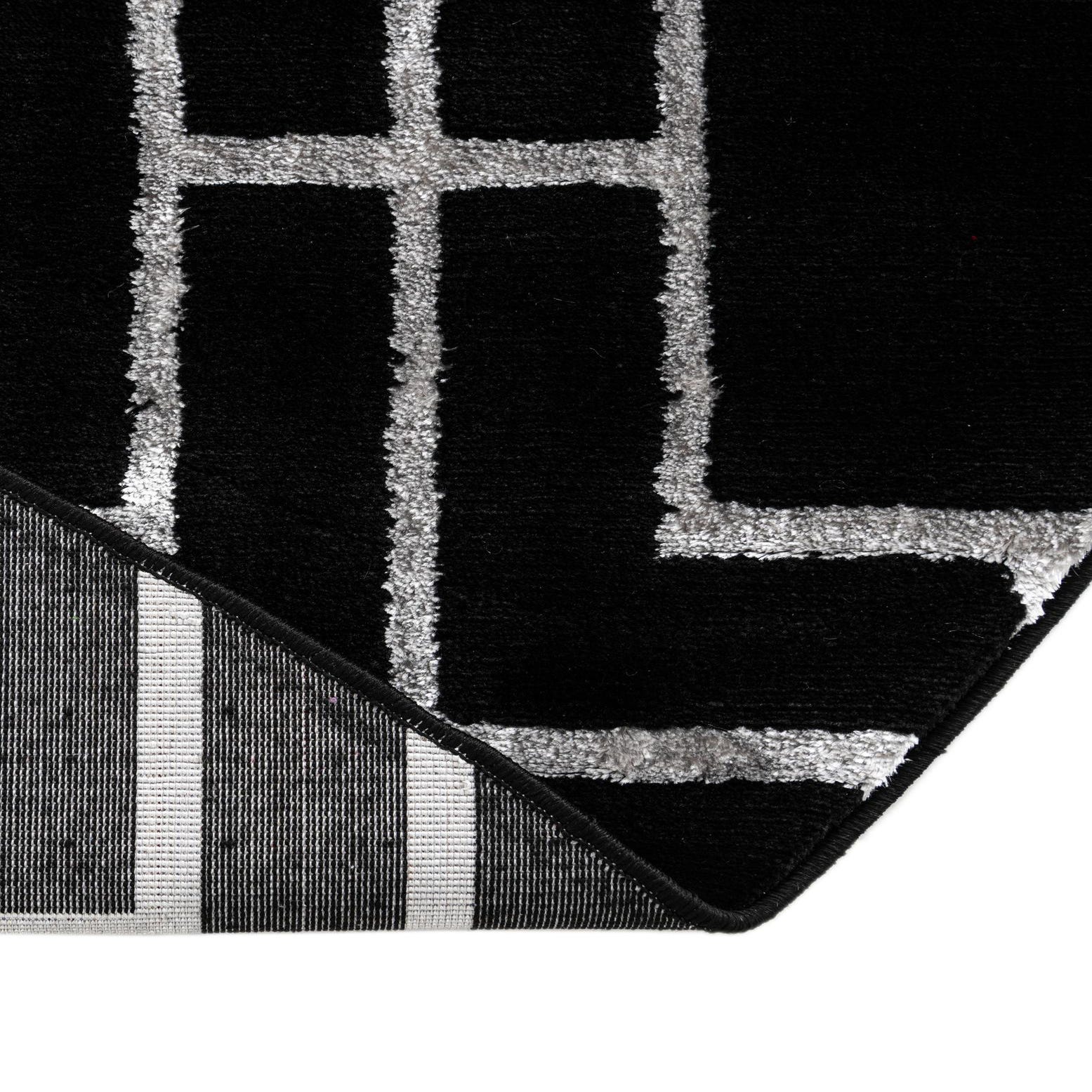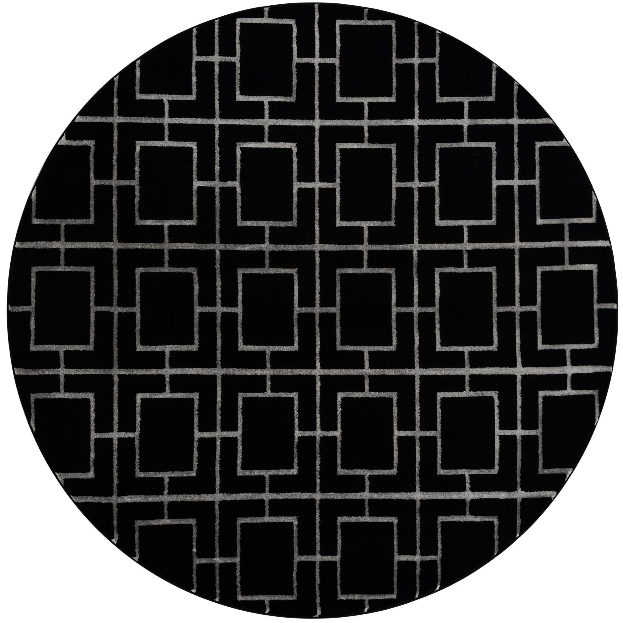 A round black area rug with a modern silver geometric trellis pattern, suitable for a living room or bedroom.