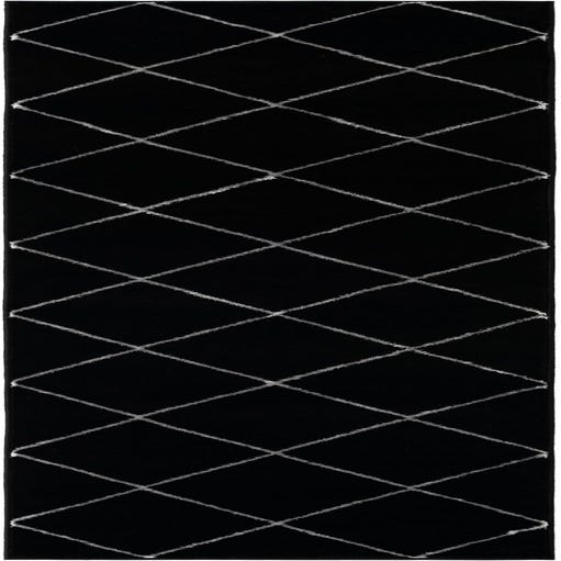 A bold, geometric diamond lattice in silver threads crosses a deep black field for a clean, modern look. Machine-made from 70% polypropylene and 30% polyester, the rug has a dense, smooth pile underfoot while the silver lines are slightly raised and softly textured, giving a subtle hand-drawn effect that adds depth without interrupting the graphic pattern.